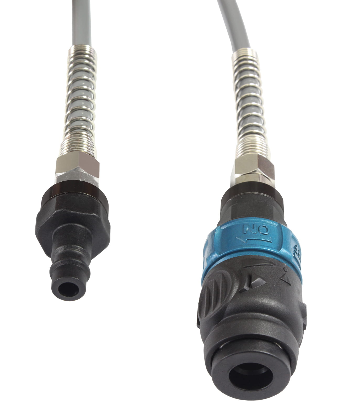 Wąż okuto w szybkozłącza „Ultra Light Safe” pozwalające na szybkie podłączenie i bezpieczne korzystanie z wszelkiego rodzaju narzędzie pneumatycznych jak np: pistoletów do przedmuchiwania, mycia, ropowania, szlifierek, kluczy pneumatycznych, czy nitownic.