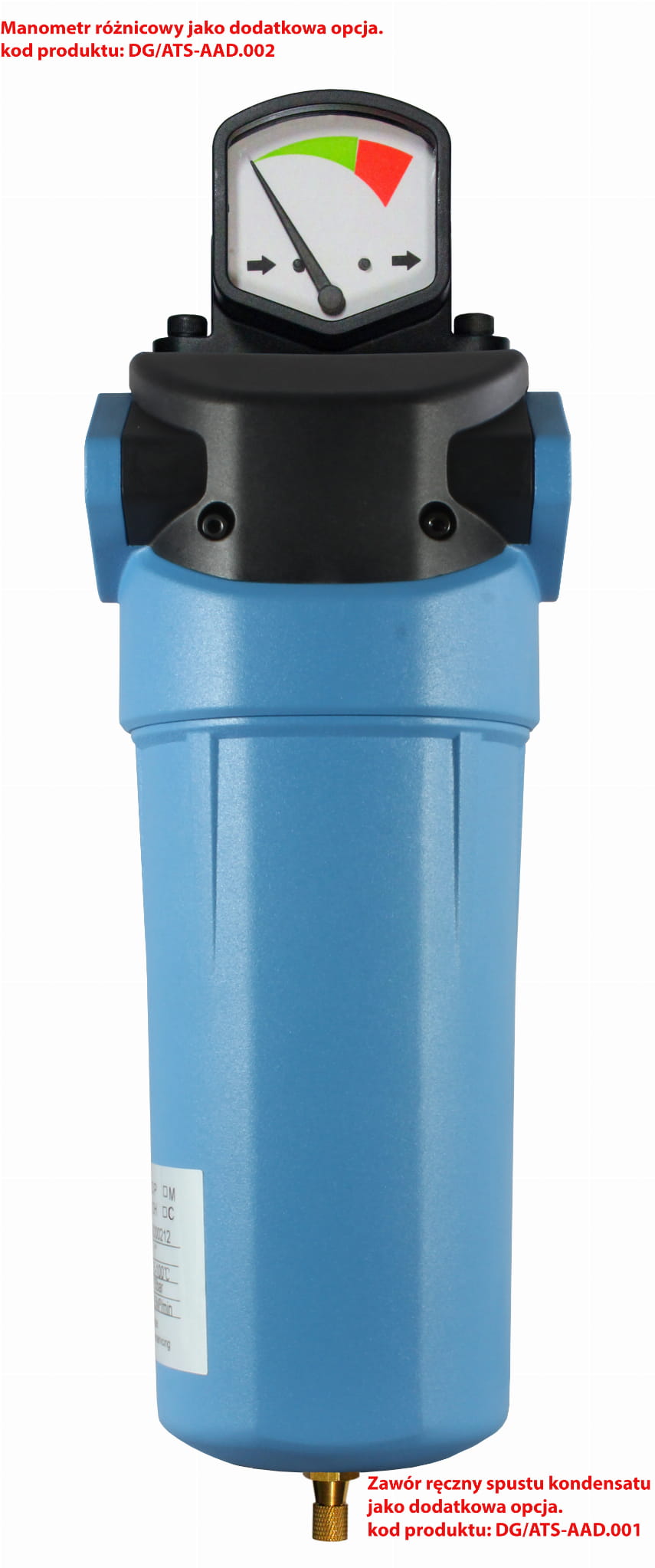 Dodatkowo filtr można wyposażyć w spust kondensatu (ręczny lub automatyczny) oraz manometr różnicowy.
