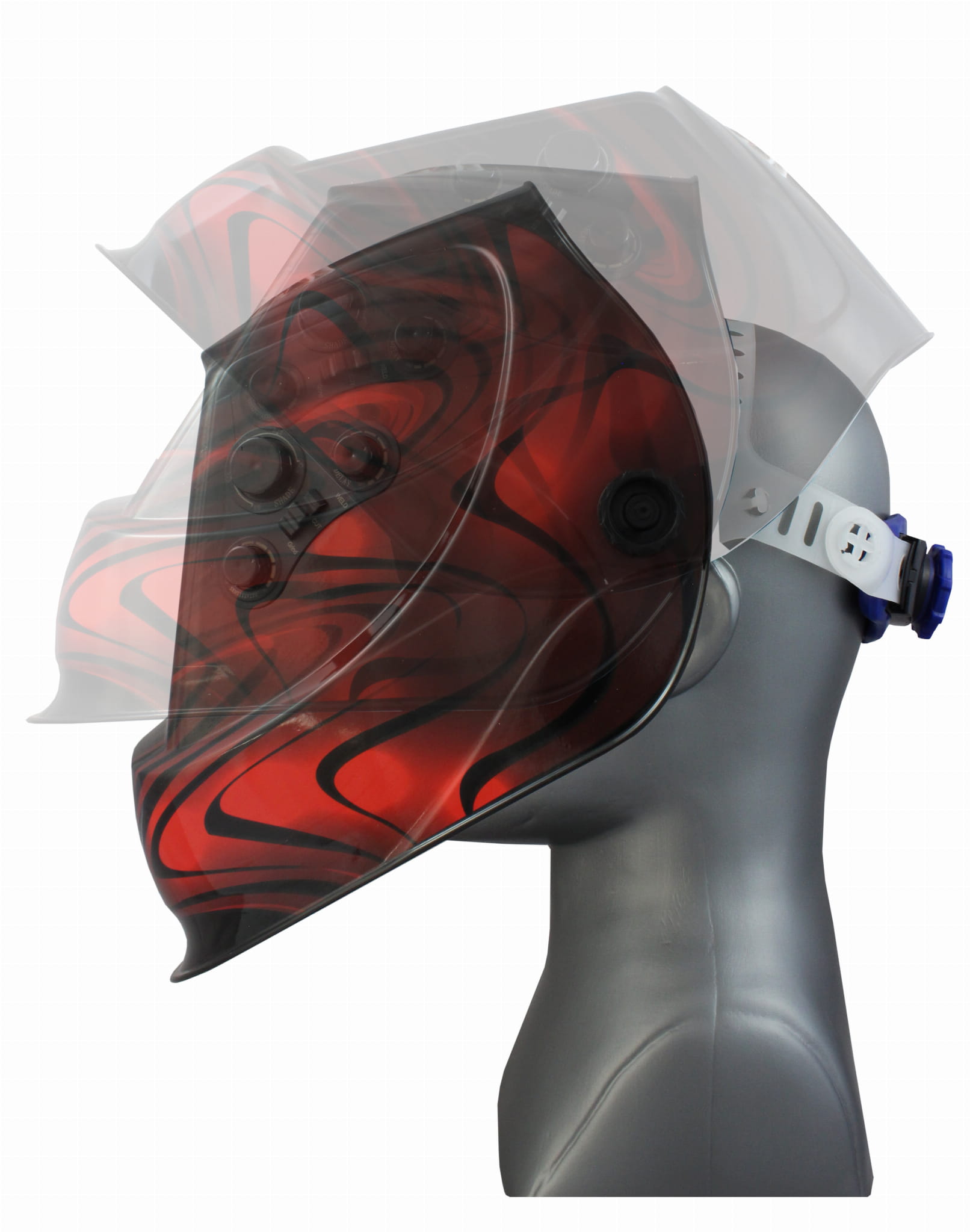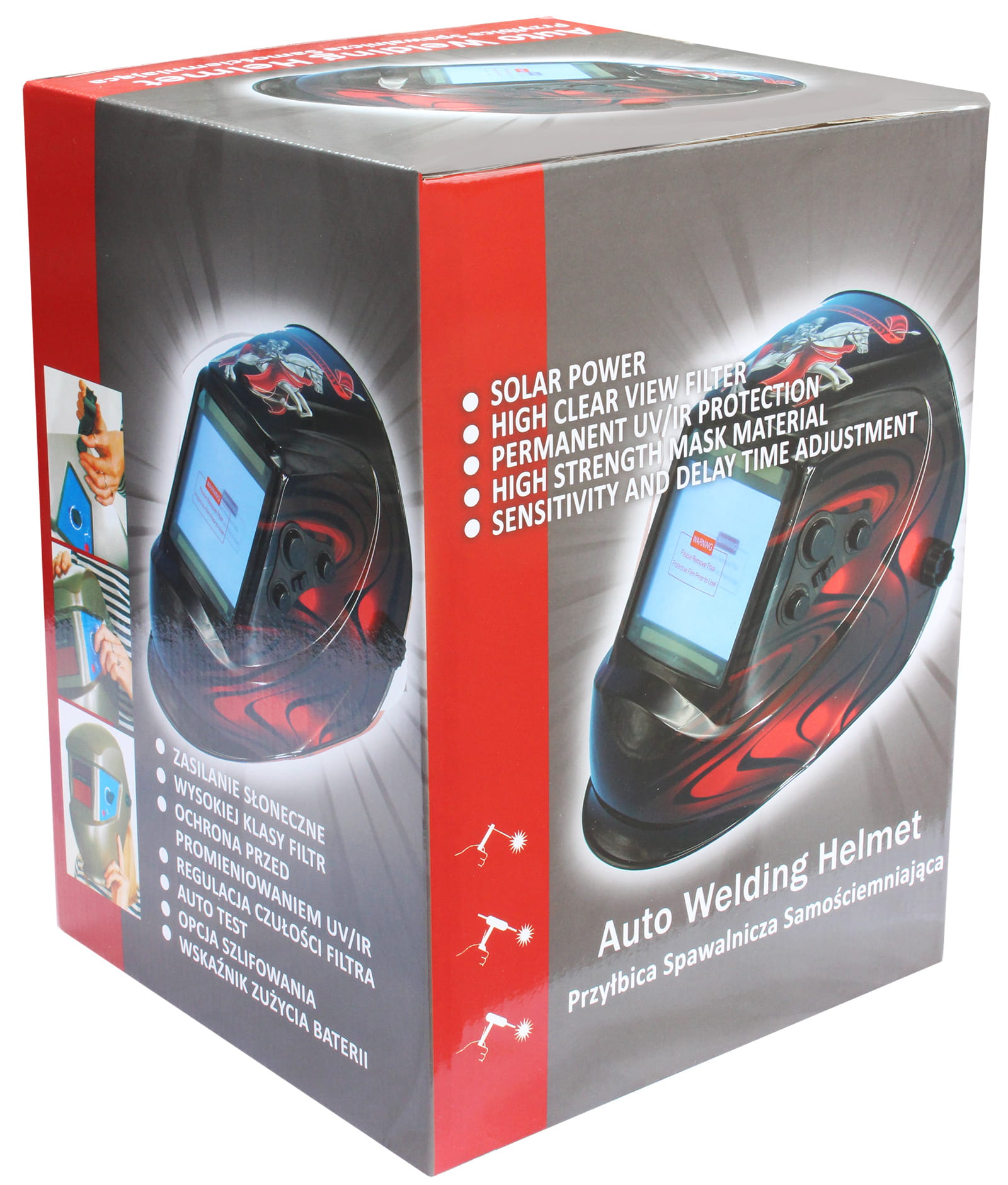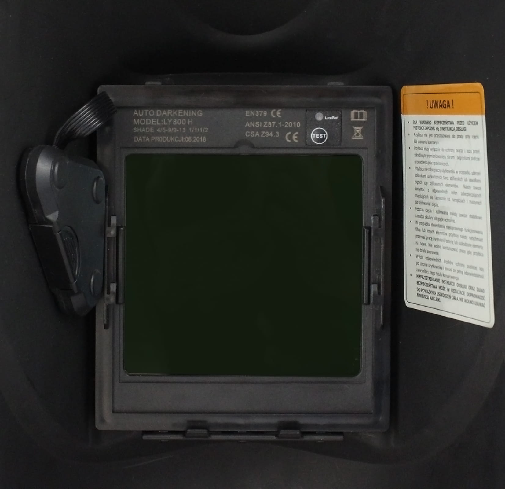 Przyłbica posiada regulację poziomu zaciemniania, opcję TEST, wybór czasu zwłoki i czułości oraz dodatkowe ustawienie GRIND przeznaczone do szlifowania oraz CUT do cięcia plazmowego.