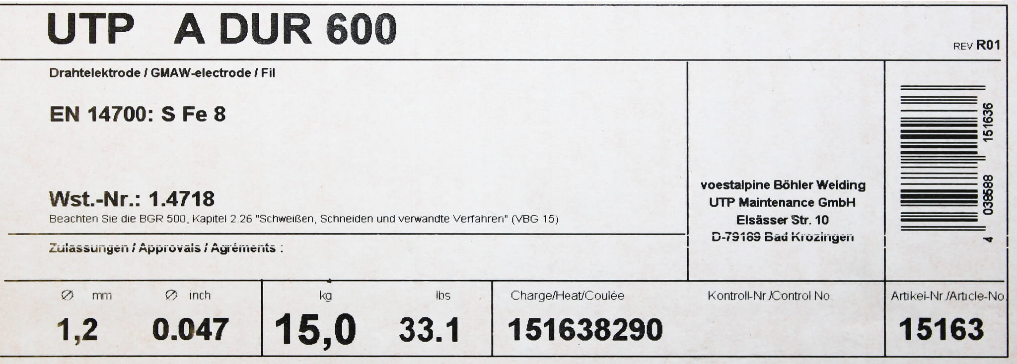 Drut Bohler UTP A DUR 600 (54-60 HRC) do spawania metodą MAG elementów konstrukcyjnych narażonych na silne uderzenia i średnie ścieranie. Główne zastosowania znajduje w kamieniołomach, zakładach kruszenia, kopalniach, hutach, cementowniach oraz narzędziach do cięcia i matrycach w przemyśle samochodowym. Pomimo wysokiej twardości, napoina jest bardzo twarda, odporna na pękanie i ma doskonałe właściwości tnące. Możliwa obróbka przez szlifowanie.