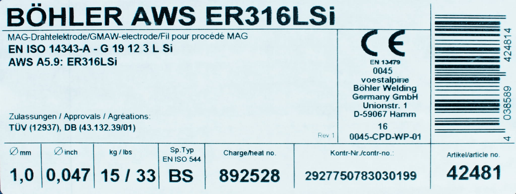 BOHLER MIG MAG CHROME-NICKEL WELDING WIRE 316LSi 1.0x15kg