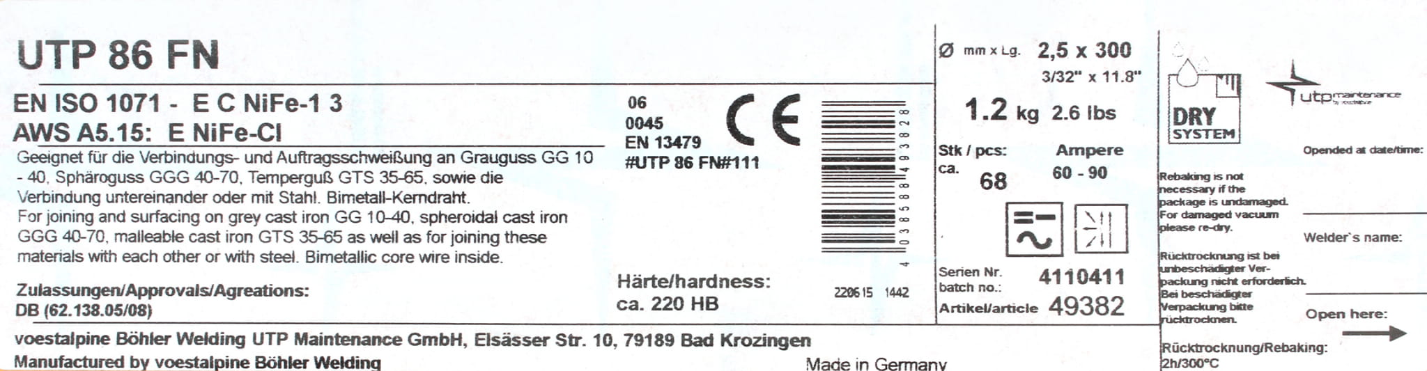Elektrody UTP 86 FN do łączenia i napawania żeliwa szarego płytkowego EN GJL 100 - EN GJL 400, żeliwa sferoidalnego EN GJS 400 - EN GJS 700 oraz żeliwa ciągliwego EN GJMB 350 - EN GJMB 650. Nadają się również do łączenia tych materiałów ze sobą oraz ze stalą i staliwem. Elektrody o uniwersalnym zastosowaniu do napraw, spawania konstrukcji oraz przy procesach produkcji.