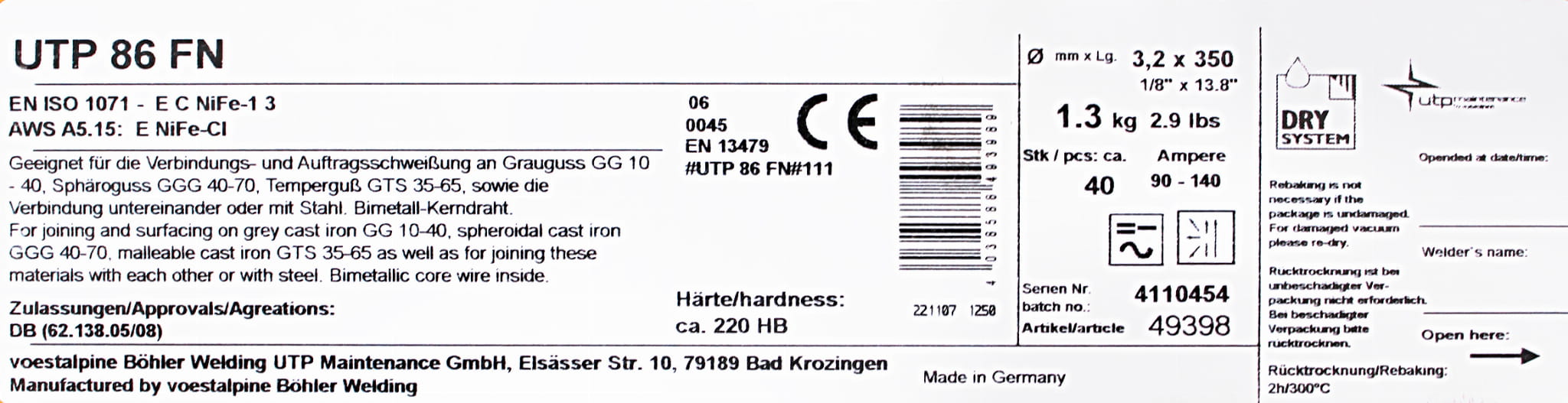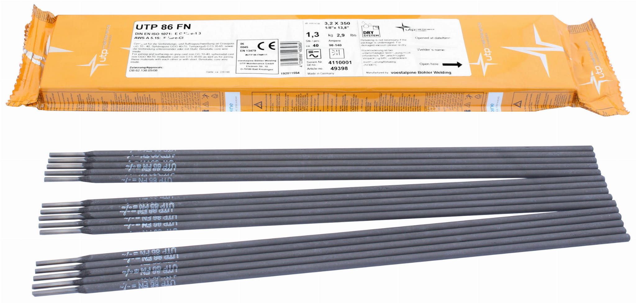 Elektrody UTP 86 FN do łączenia i napawania żeliwa szarego płytkowego EN GJL 100 - EN GJL 400, żeliwa sferoidalnego EN GJS 400 - EN GJS 700 oraz żeliwa ciągliwego EN GJMB 350 - EN GJMB 650. Nadają się również do łączenia tych materiałów ze sobą oraz ze stalą i staliwem. Elektrody o uniwersalnym zastosowaniu do napraw, spawania konstrukcji oraz przy procesach produkcji.