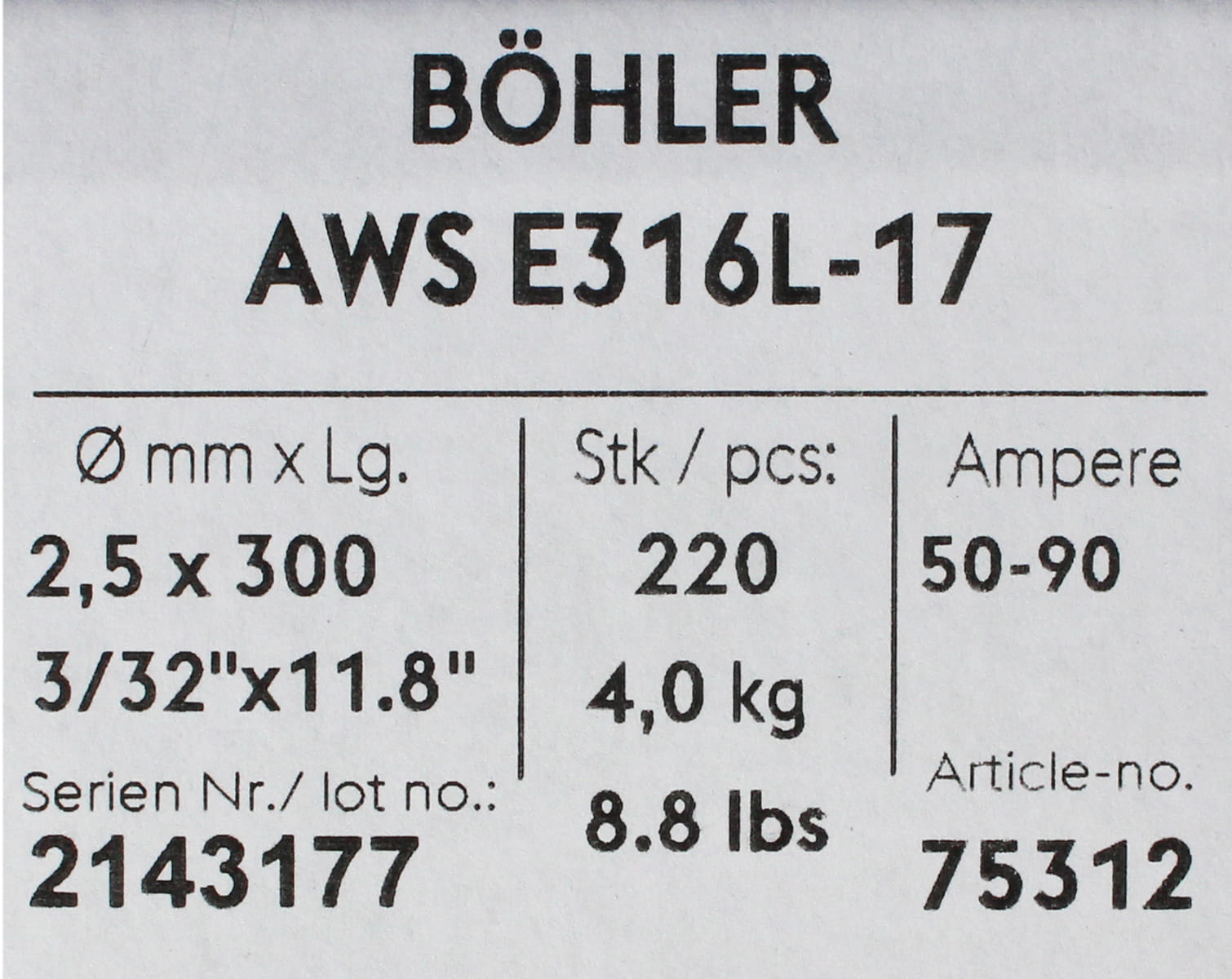 BOHLER MMA RUTILE CHROME-NICKEL ELECTRODE 316L 2.5x300MM