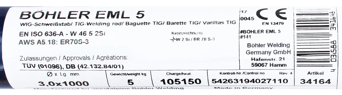 BOHLER TIG WELDING WIRE STEEL EML5/W2Si/ER70S-3 3.0x1000MM