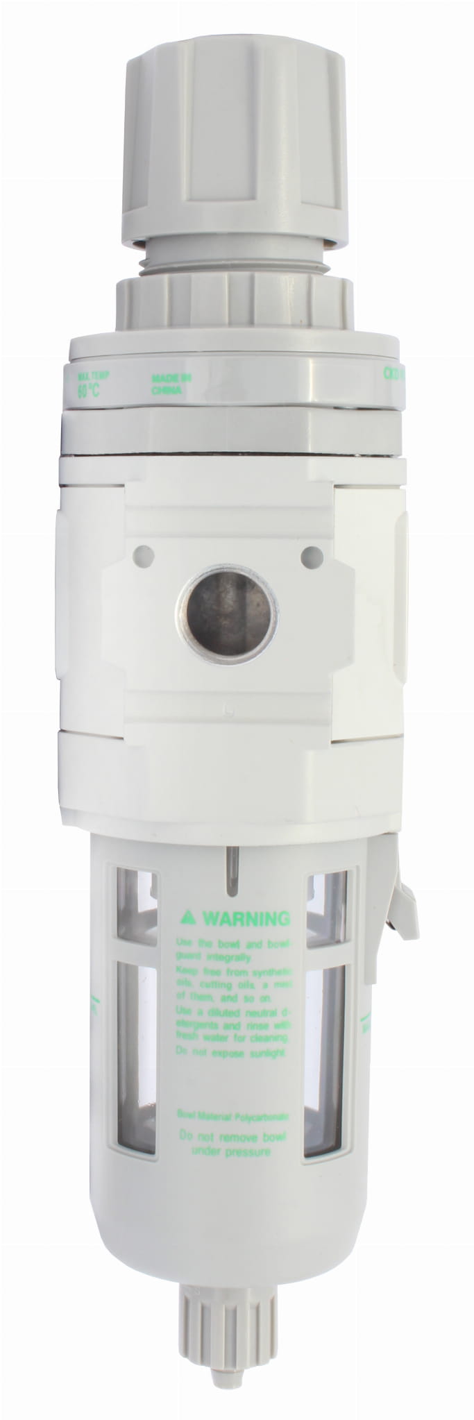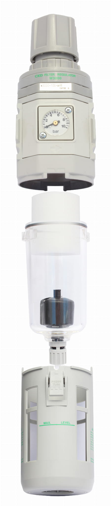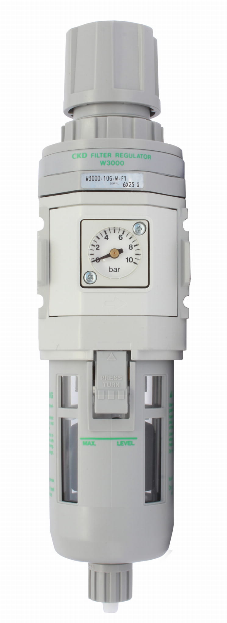 Profesjonalny filtr z reduktorem W3000 o dużej dokładności 5µm, uznanej i cenionej na rynku japońskiej firmy CKD z spustem automatycznym.