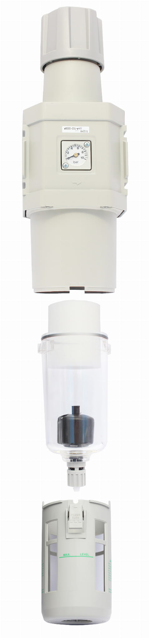 Profesjonalny filtr z reduktorem W8000 o dużej dokładności 5µm, uznanej i cenionej na rynku japońskiej firmy CKD z spustem automatycznym.