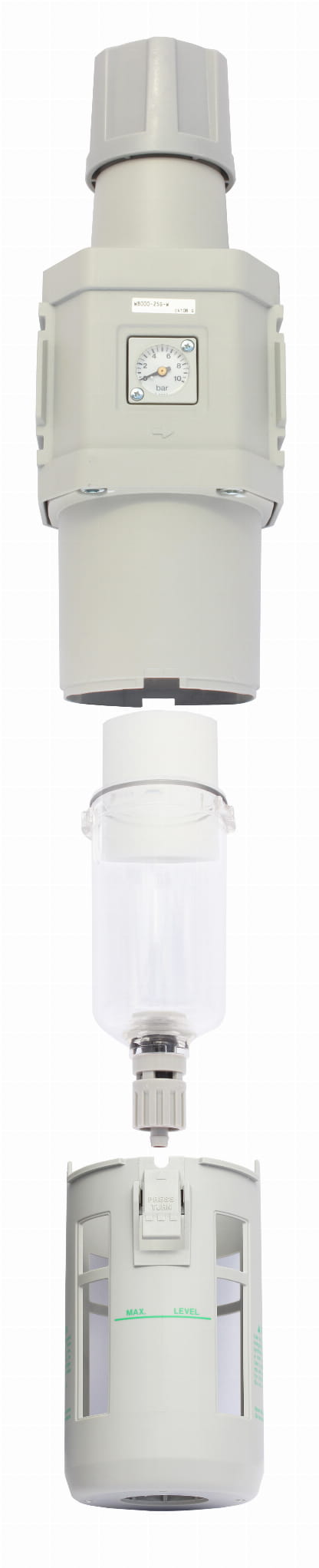 Profesjonalny filtr z reduktorem W8000 o dużej dokładności 5µm, uznanej i cenionej na rynku japońskiej firmy CKD z spustem ręcznym.