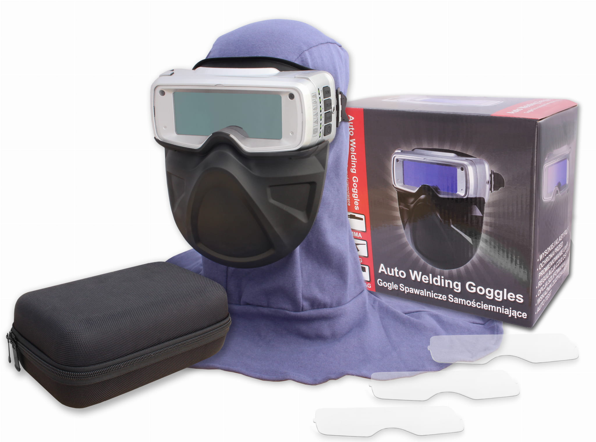 Dodatkowo w skład wyposażenia zestawu wchodzi: osłona twarzy, kaptur ochronny zabezpieczający twarz oraz głowę spawacza.