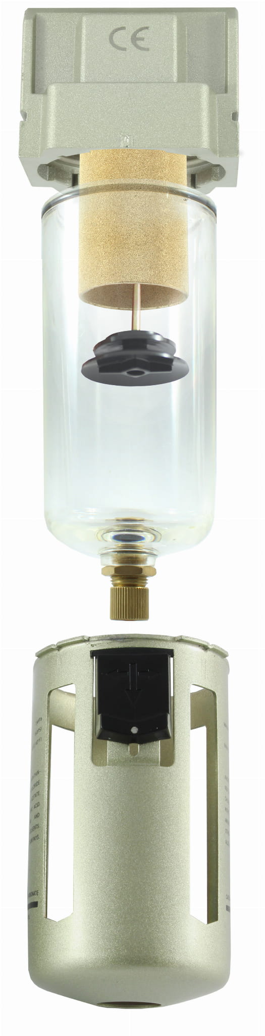 Wkład filtrujący wykonany jest ze spieku brązu zapewnia filtrację mechaniczną cząstek stałych na poziomie 40 mikronów. Wkład filtrujący jest stały i nie wymaga wymiany przez cały czas użytkowania. Obsługa filtra sprowadza się do ręcznego spustu skroplin ze zbiornika zaworem spustowym.
