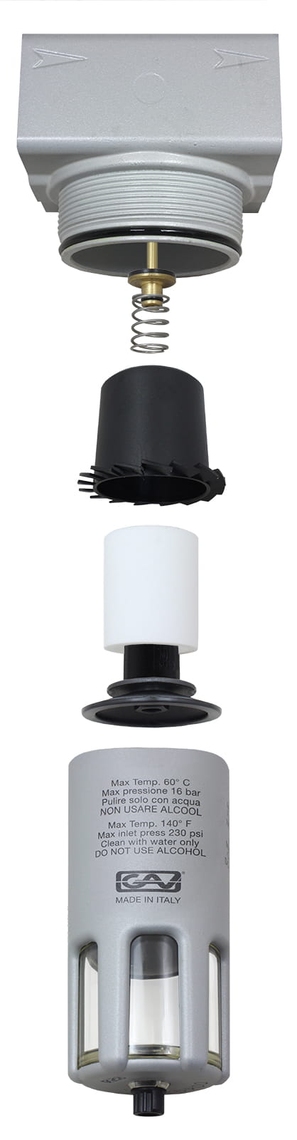 Filtr służy do usuwania zanieczyszczeń stałych takich jak rdza, pył oraz ciekłych takich jak woda, olej, pochodzących z procesu wytwarzania sprężonego powietrza w sprężarce.