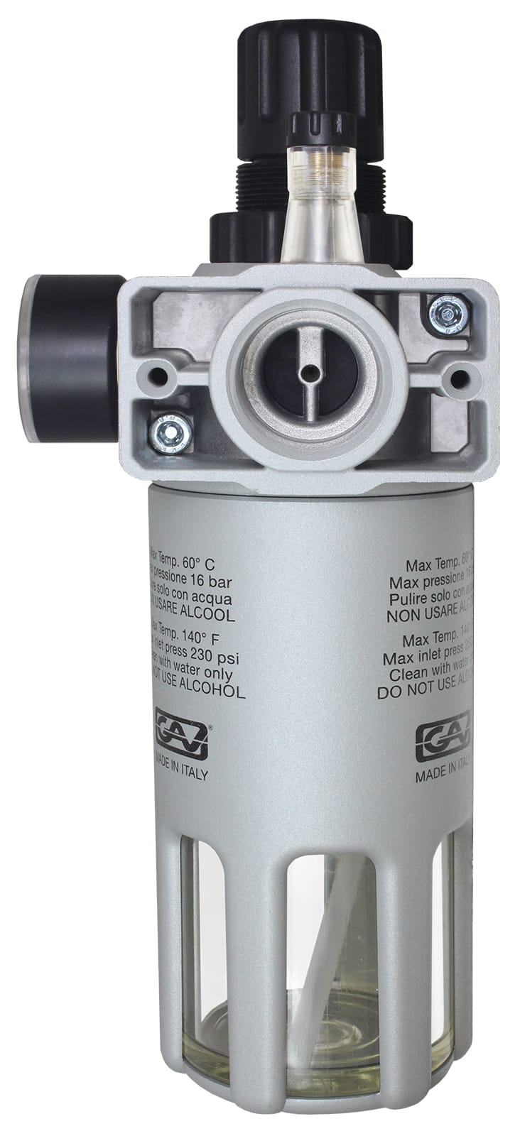 Profesjonalny zespół przygotowania sprężonego powietrza, filtr + reduktor + naolejacz FRL-300 1" uznanej i cenionej na rynku włoskiej firmy GAV z spustem ręcznym.