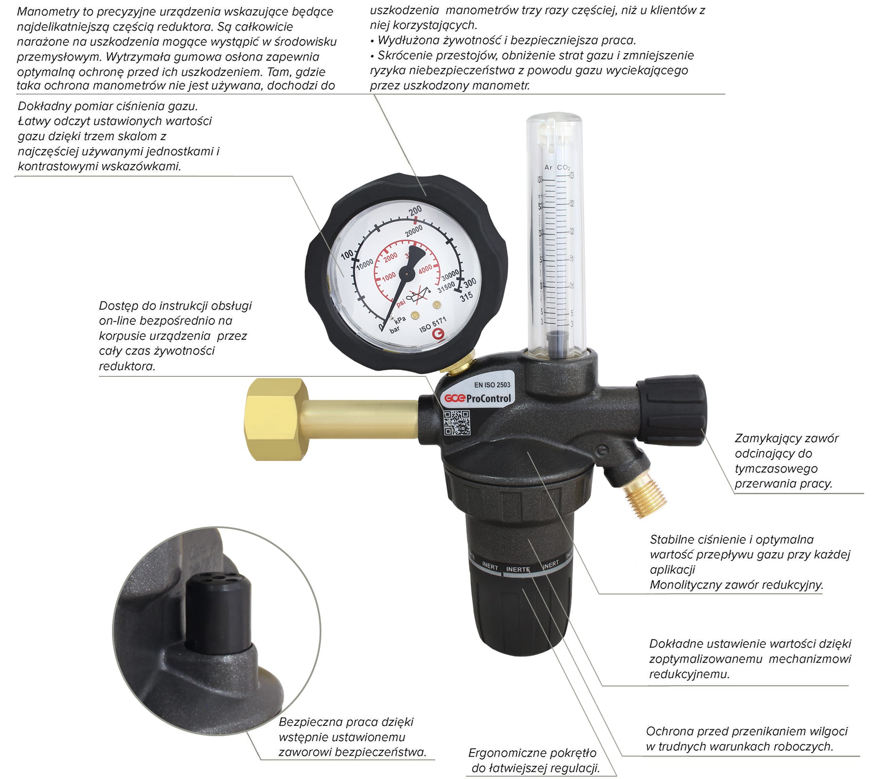Reduktory do butli GCE ProControl posiadają wytrzymałą konstrukcję, pozwalającą na codzienne użytkowanie zarówno w pomieszczeniach zamkniętych, jak również otwartych. Zwiększona ochrona manometrów minimalizuje ryzyko uszkodzenia i przestojów.