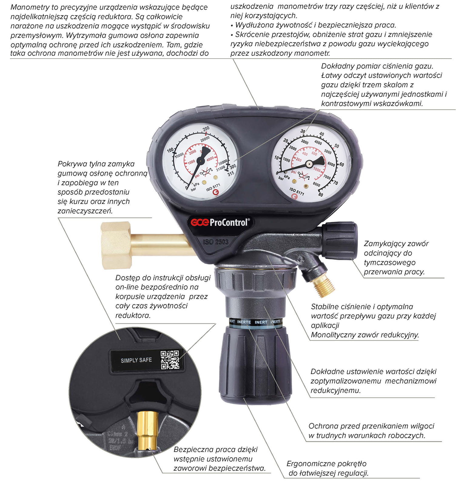 Precyzyjny regulator zapewnia dokładne dobranie dawki gazu. Wyposażony w dodatkowy zaworek odcinający wypływ gazu z butli.