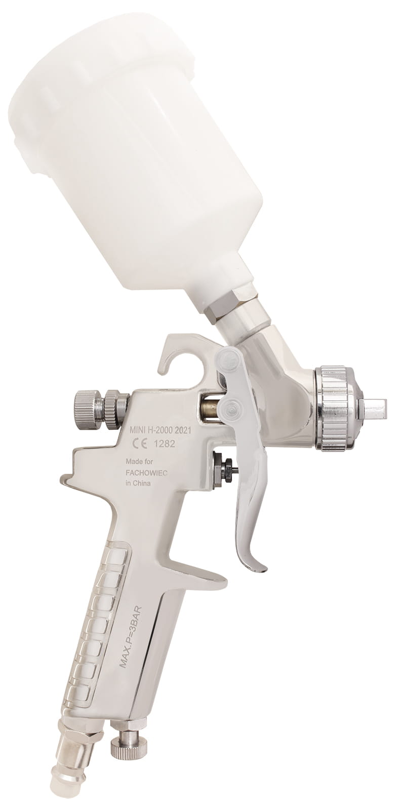 Pistolet lakierniczy MINI H2000 z dyszą 0.8mm jest pistoletem wykonanym w systemie wysokociśnieniowym HP (średnie zapotrzebowanie powietrza, wysokie ciśnienie), przy którym używamy ciśnienia 3 bar.