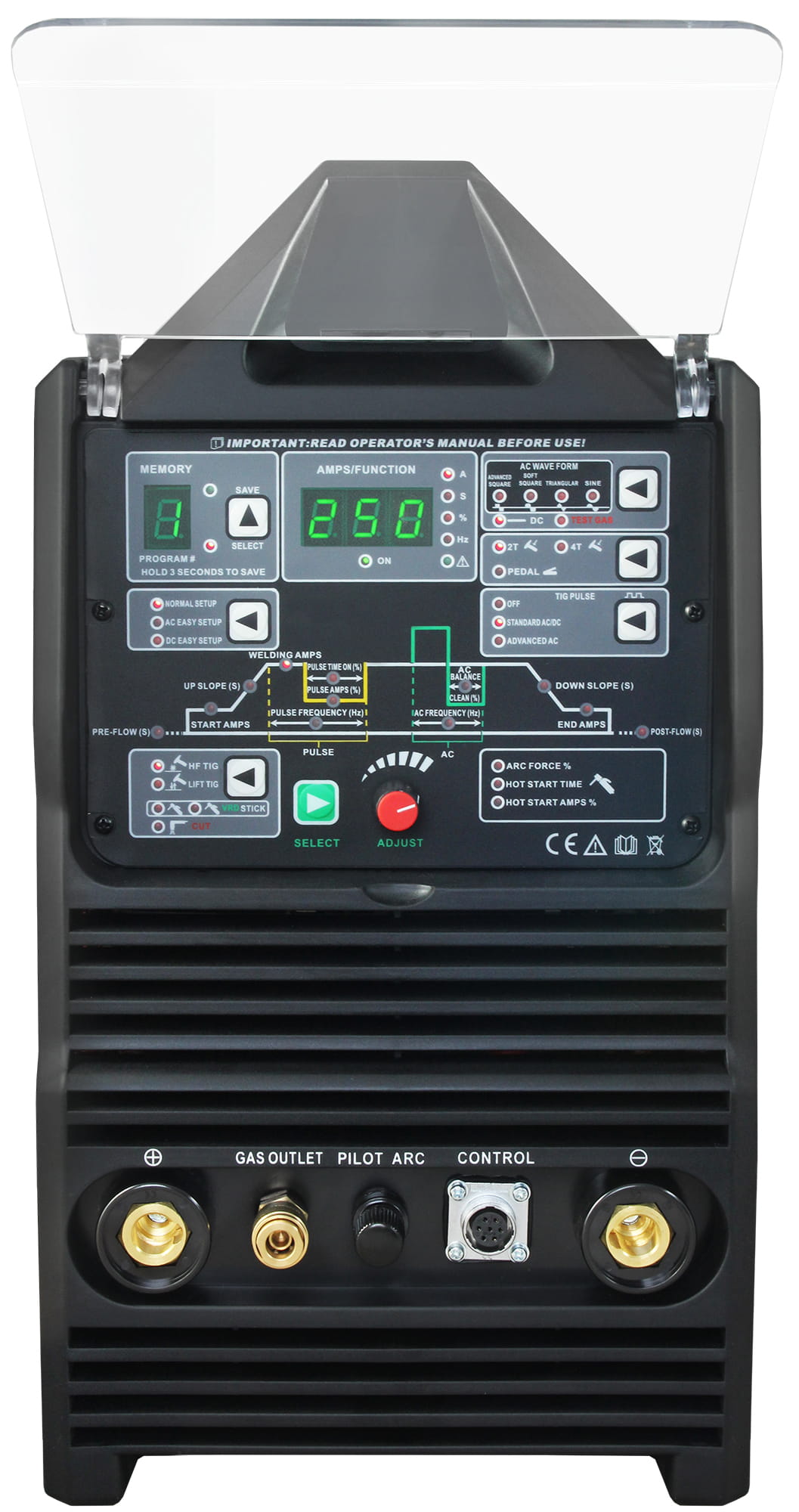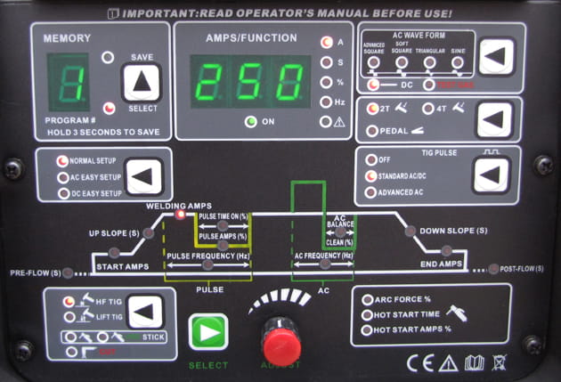 This top-class device sets new standards among AC/DC welding machines, and the user-friendly control panel ensures selection of all necessary operating parameters.