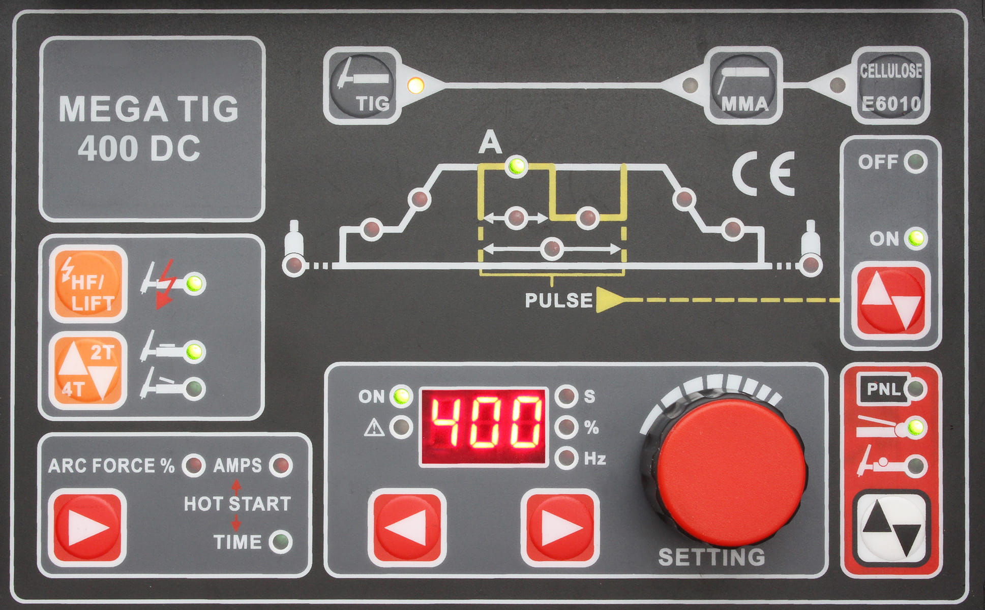 - PULSE - pulsed current function, mainly used for welding thin elements (even with a thickness of 0.1 mm), metals with a low melting point such as lead, or welding in forced positions. Other advantages of pulsed current welding include a smaller heat-affected zone, greater arc stability, greater penetration depth, and improved weld face appearance.