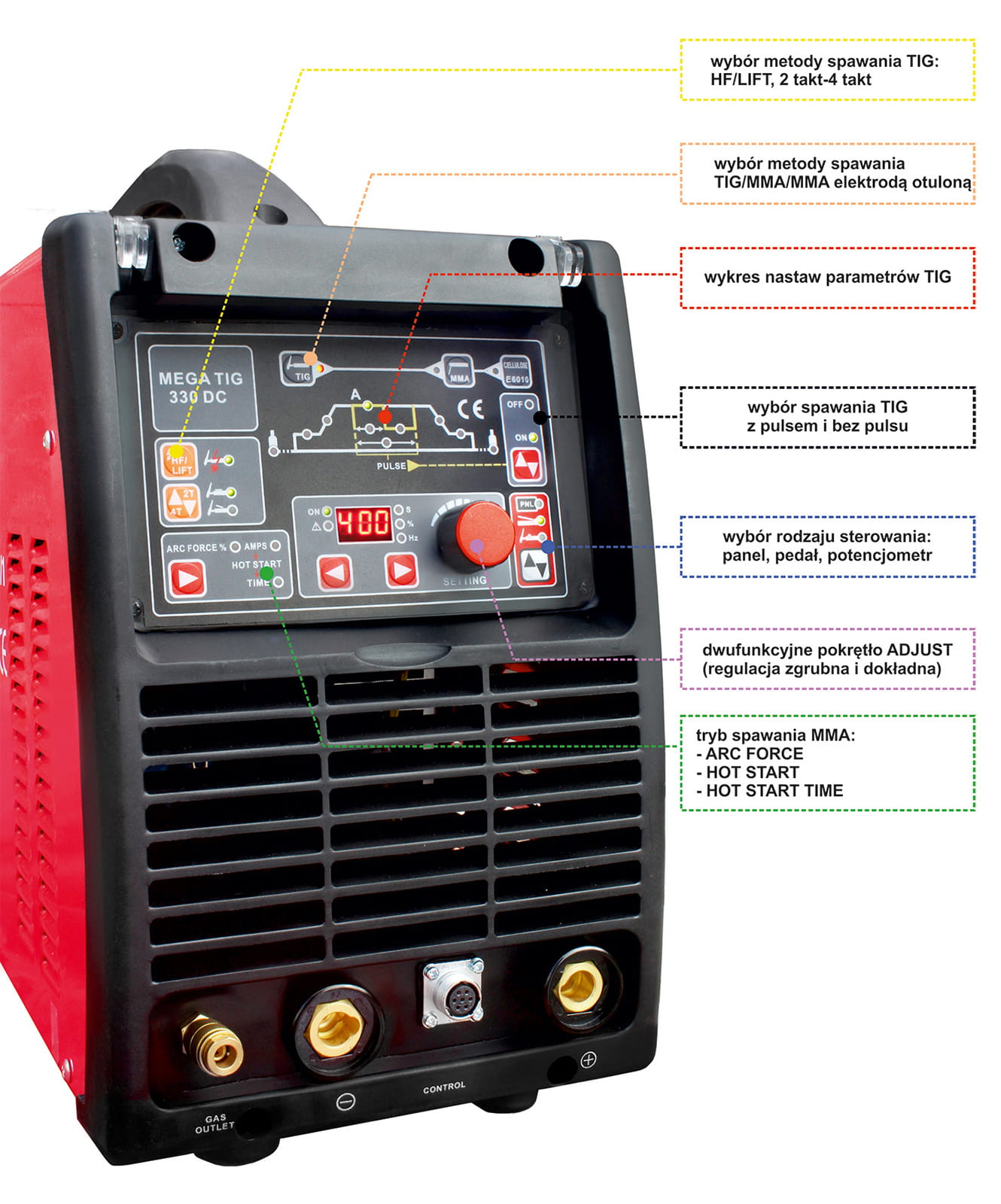 - ARC FORCE - function stabilizing the welding process by maintaining the welding arc voltage value regardless of its length and facilitating control over the amount of spatter.
