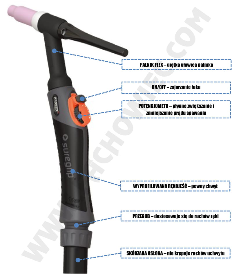 - The welding machine comes complete with a top-class welding torch: TIG PARKER SUREGRIP SGT26 FLEX 4m with a flexible torch head.