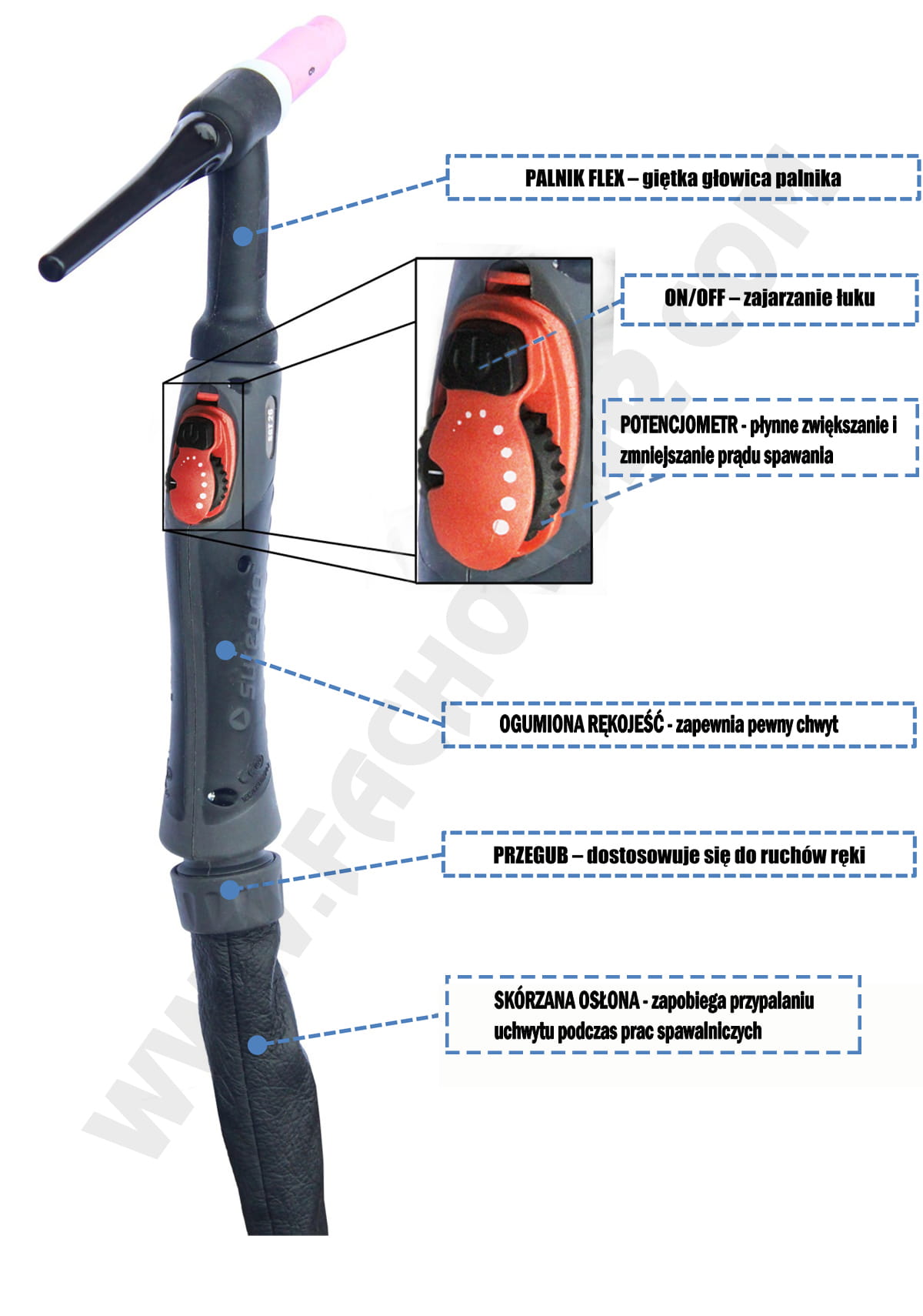- The set with the welder includes a top-class welding torch: TIG PARKER SUREGRIP SGT26 FLEX 4M with welding current adjustment