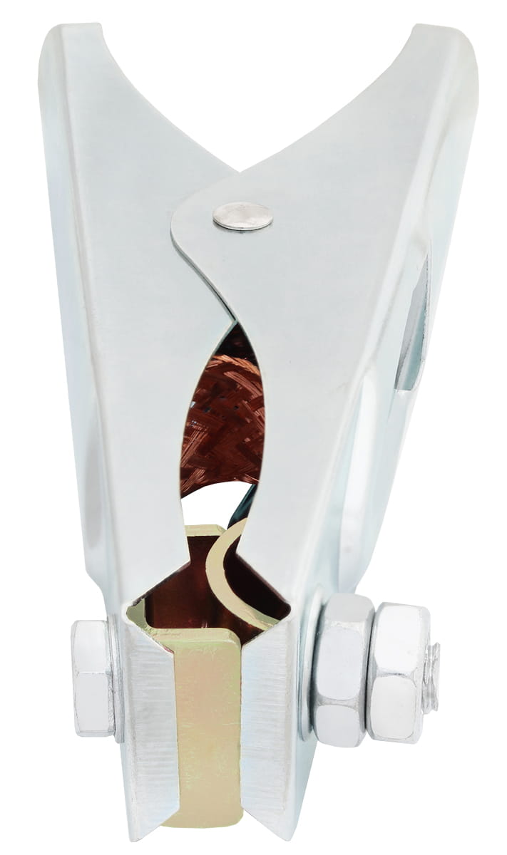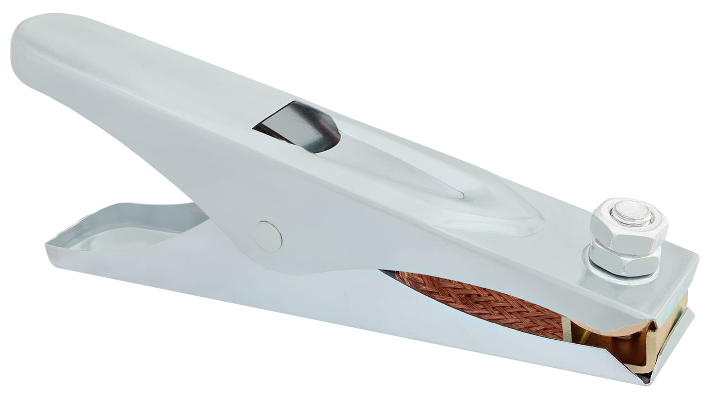 Zacisk masowy kleszczowy wykorzystywany w spawalnictwie do mocowania przewodu masowego na materiale spawanym tworząc obwód spawania. Miedziane styki na kleszczach z miedzianą plecionką oraz mocna sprężyna zapewniają dobre i pewne mocowanie na materiale spawanym oraz dobre przewodnictwo prądu.