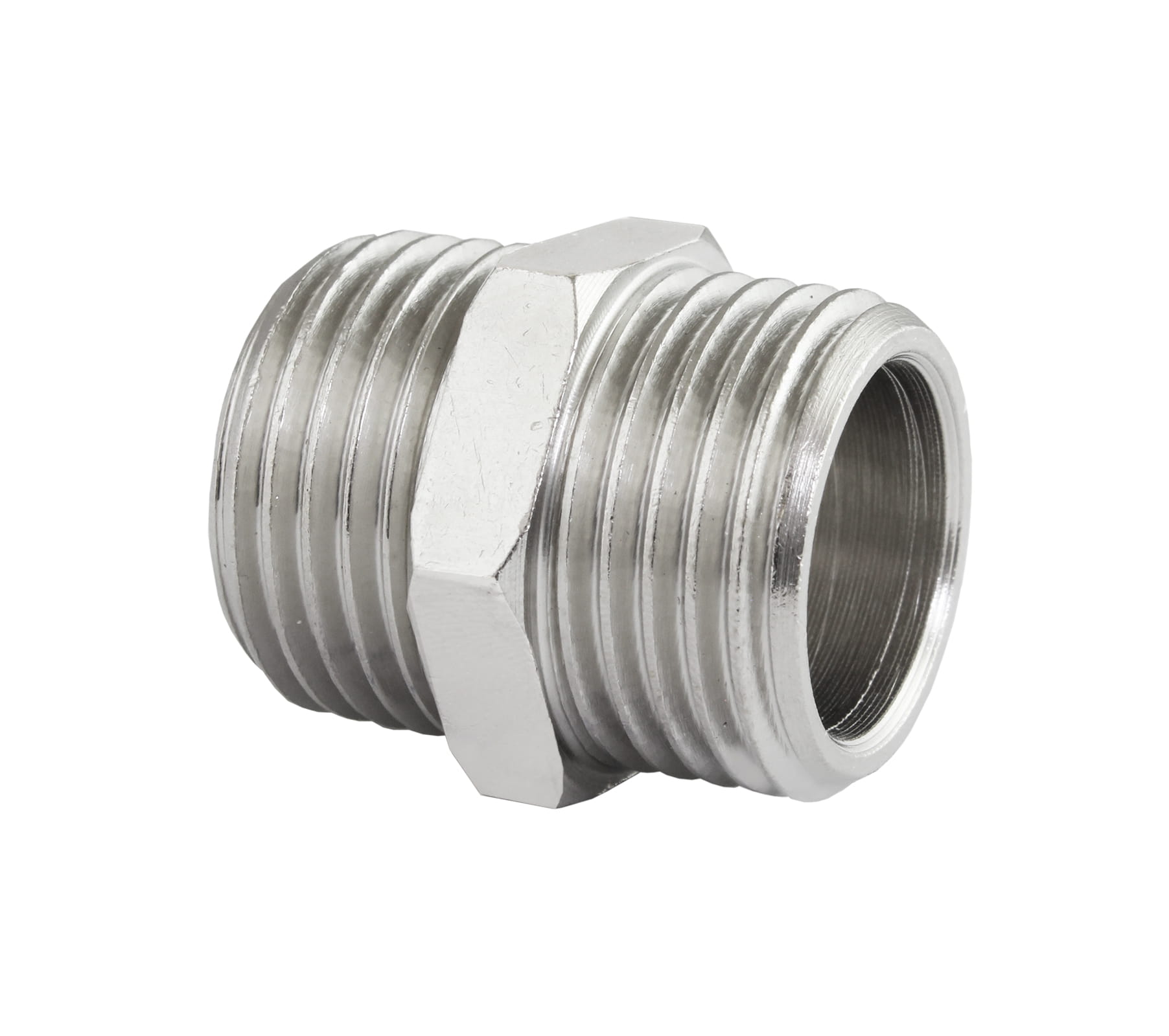 Łącznik - nypel wykonany z mosiądzu niklowanego.