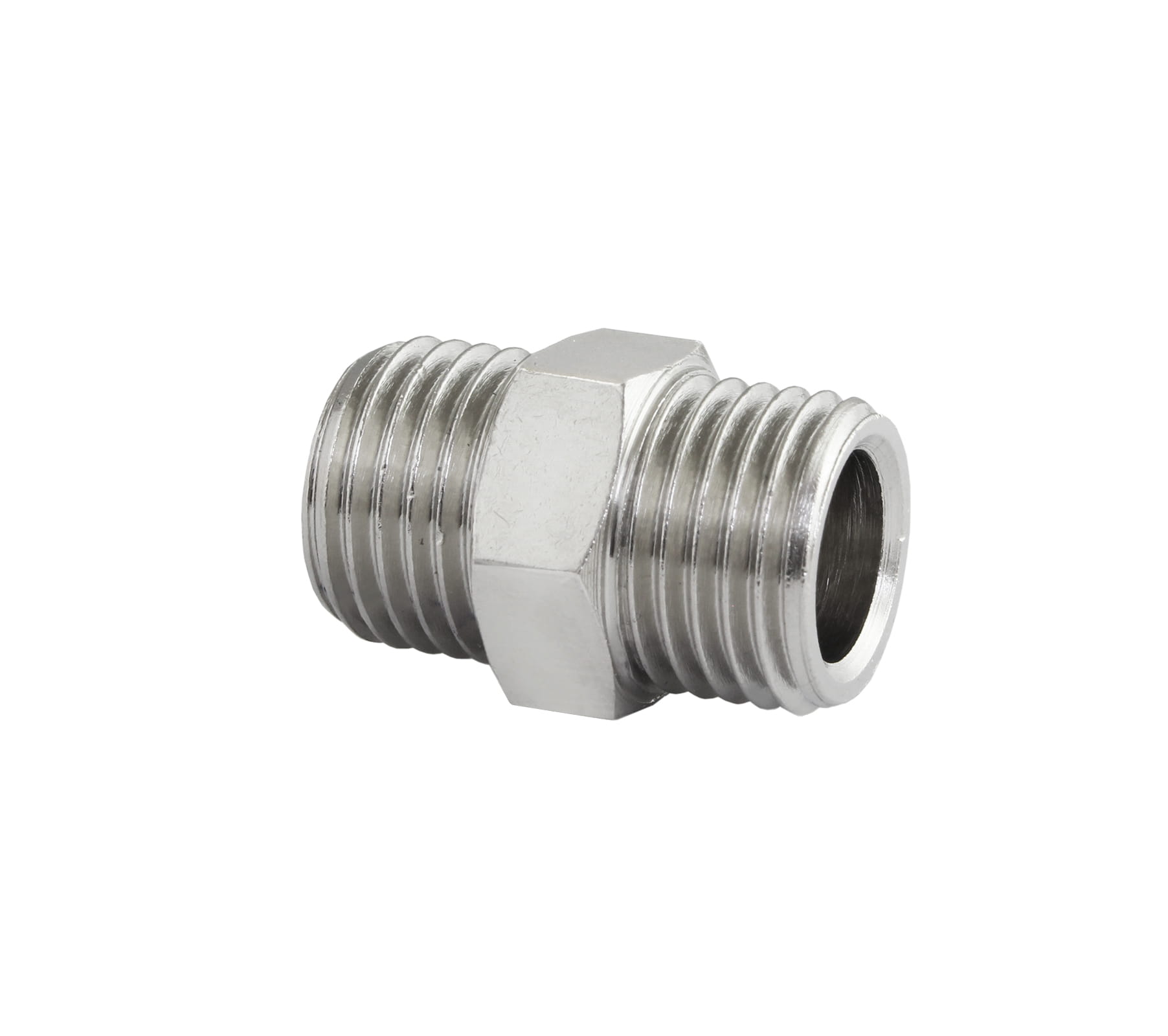 Łącznik - nypel wykonany z mosiądzu niklowanego.