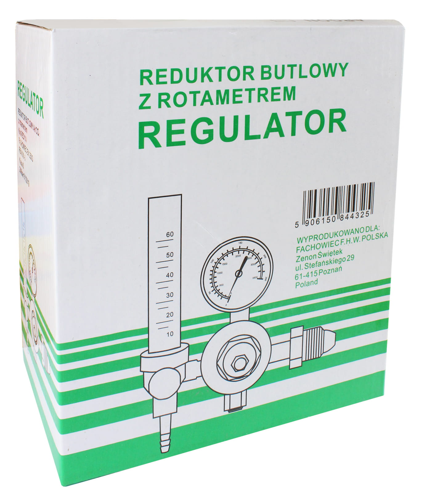 Profesjonalny, jednostopniowy reduktor butlowy z rotametrem wskazującym przepływ gazu, manometrem informującym o ciśnieniu w butli.