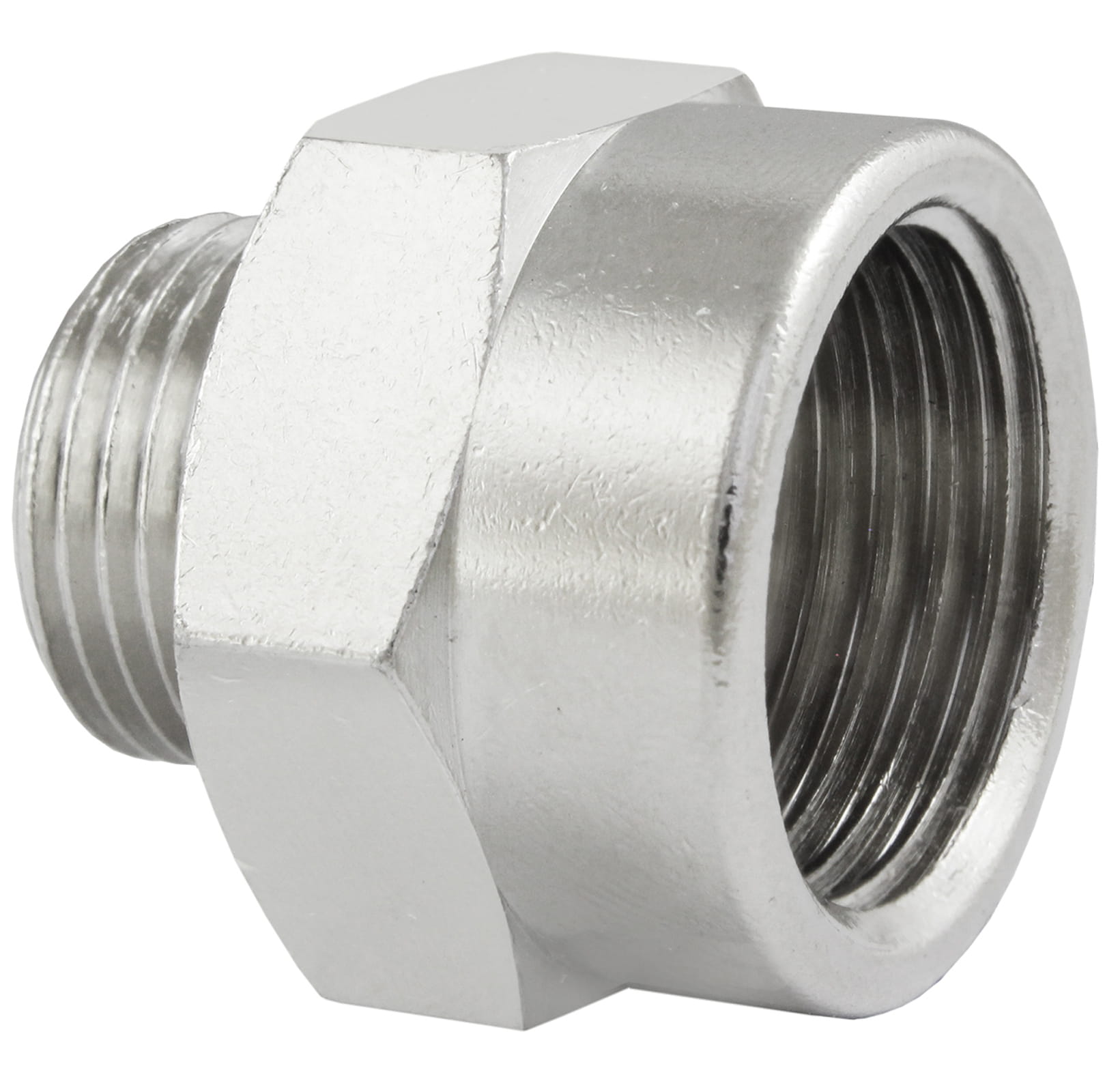 Redukcja mieszana wykonana z mosiądzu niklowanego z gwintem zewnętrznym 1/2" i wewnętrznym 3/4".