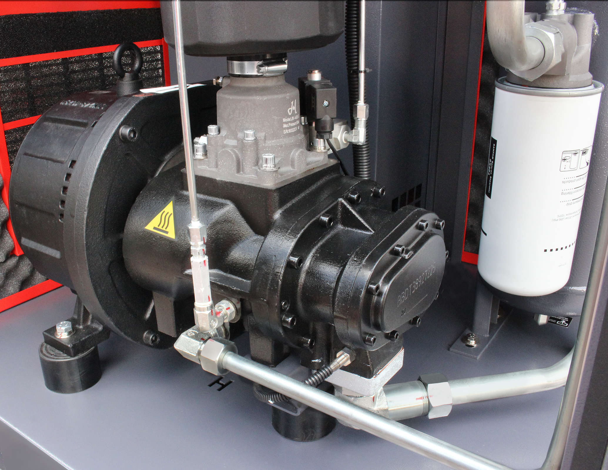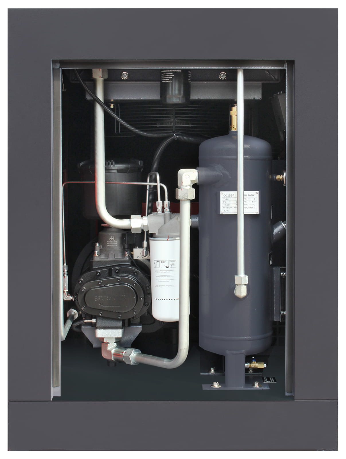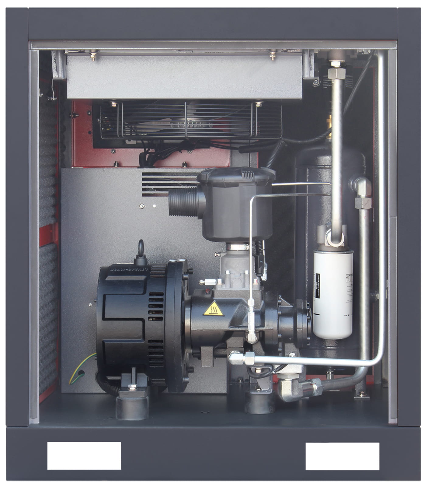 Bezpośrednie przeniesienie napędu między silnikiem a mechanizmem śrubowym skutecznie niweluje drgania skrętne oraz eliminuje konieczność regulacji tradycyjnej przekładni pasowej. Do połączeń podzespołów sprężarki zamiast tradycyjnych węży ciśnieniowych zostały zastosowane metalowe rurki, co wpływa pozytywnie na wydajność sprężarki i zwiększa jej niezawodność.