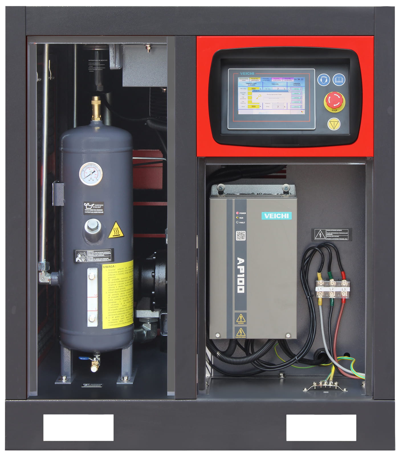 - kontrola temperatury oleju (ostrzeganie, wyłączenie sprężarki).