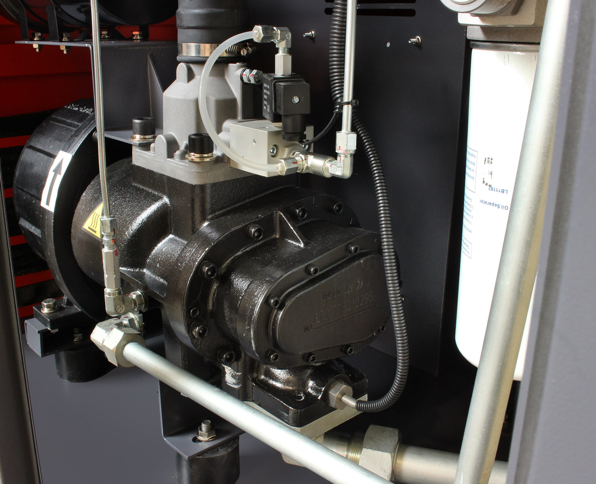 Bezpośrednie przeniesienie napędu między silnikiem a mechanizmem śrubowym skutecznie niweluje drgania skrętne oraz eliminuje konieczność regulacji tradycyjnej przekładni pasowej. Do połączeń podzespołów sprężarki zamiast tradycyjnych węży ciśnieniowych zostały zastosowane metalowe rurki, co wpływa pozytywnie na wydajność sprężarki i zwiększa jej niezawodność.