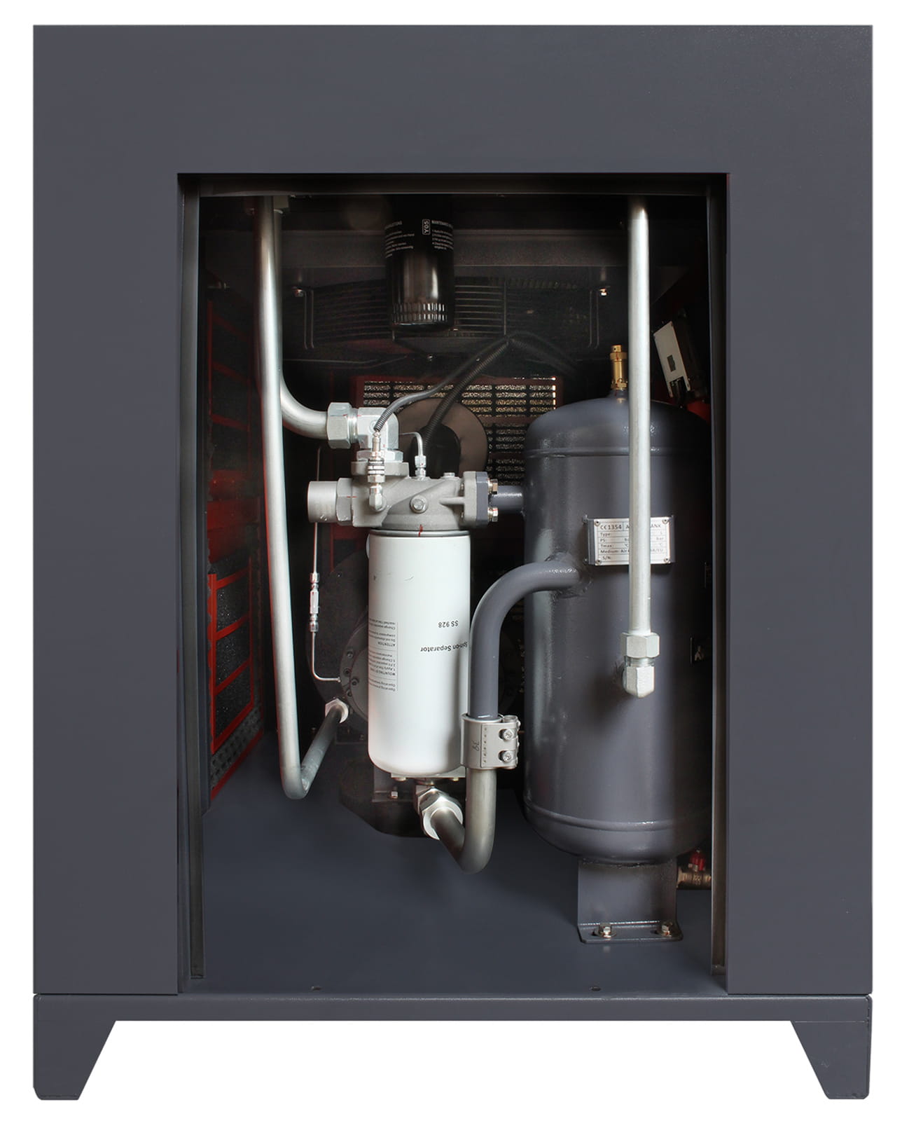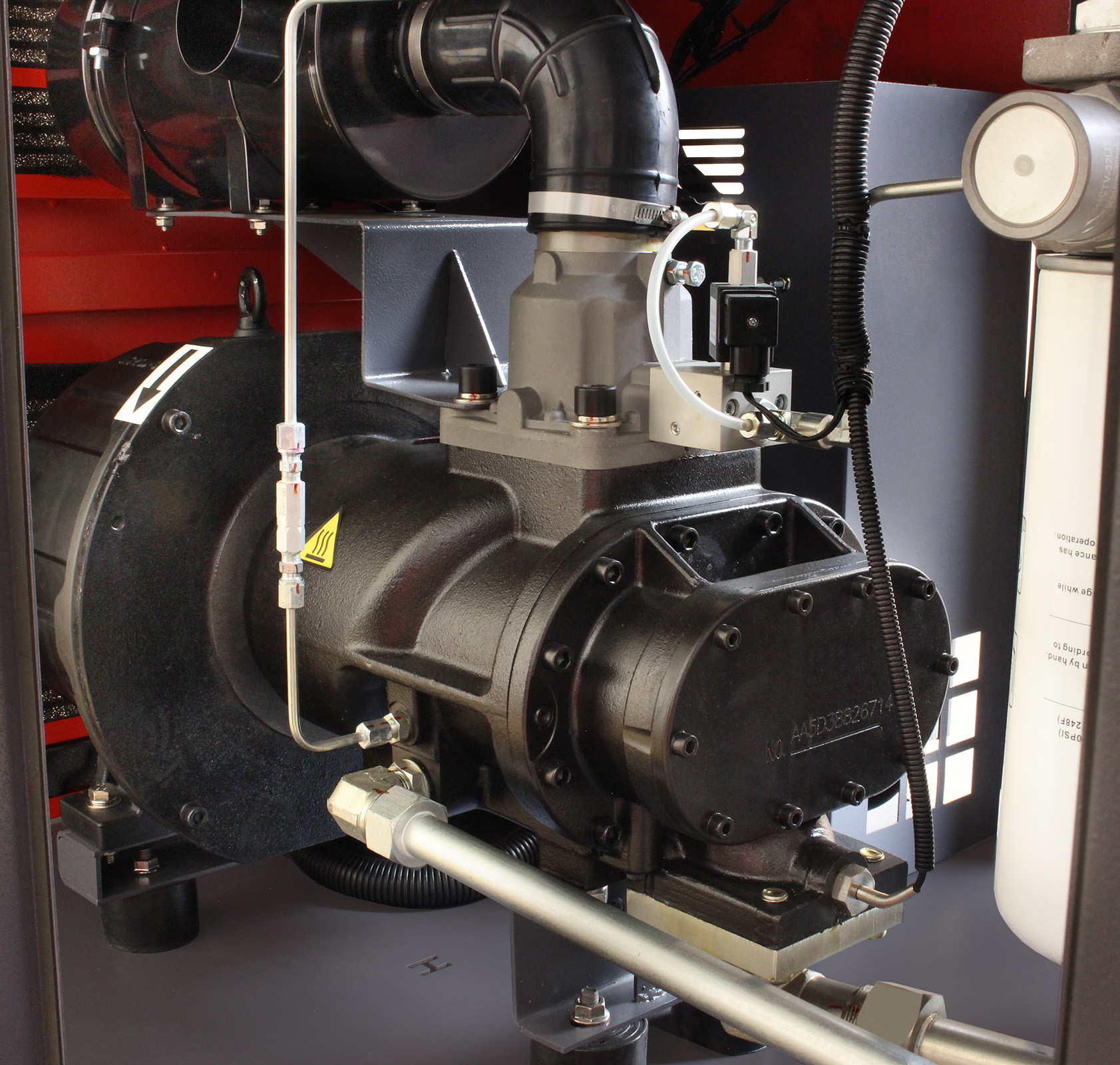 Bezpośrednie przeniesienie napędu między silnikiem a mechanizmem śrubowym skutecznie niweluje drgania skrętne oraz eliminuje konieczność regulacji tradycyjnej przekładni pasowej. Do połączeń podzespołów sprężarki zamiast tradycyjnych węży ciśnieniowych zostały zastosowane metalowe rurki, co wpływa pozytywnie na wydajność sprężarki i zwiększa jej niezawodność.