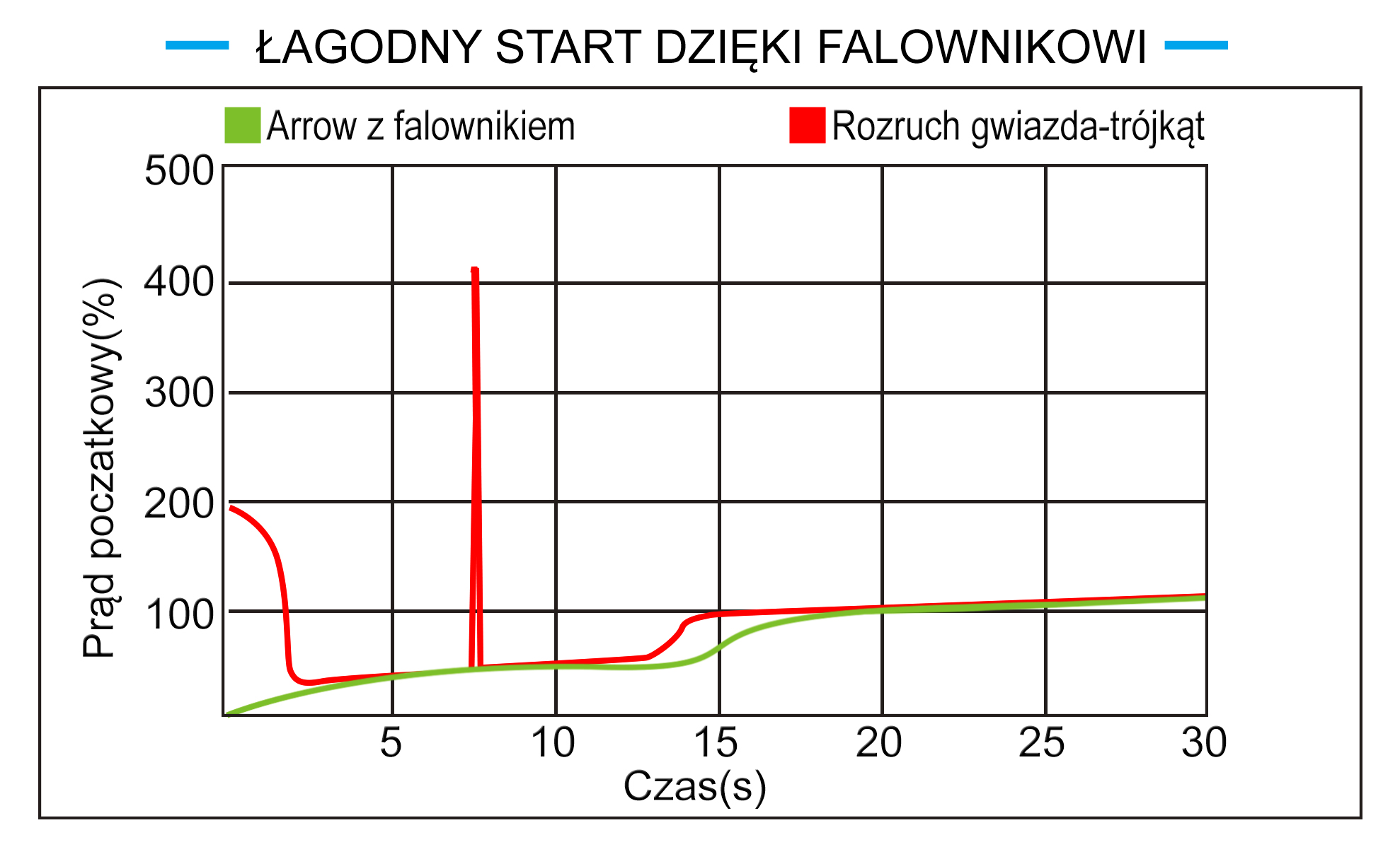 Falownik, czyli przetwornica częstotliwości, umożliwia łagodny start sprężarki z pominięciem skoków występujących w innych metodach rozruchu.