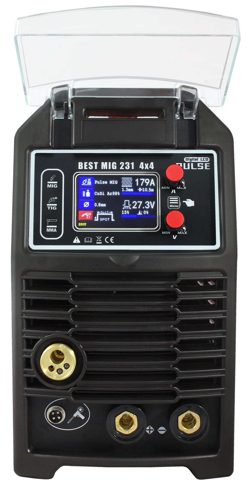The multifunctional inverter welding machine BEST MIG 231 4x4 with a four-roll wire feeder is designed for manual arc welding of metals and metal alloys using the following methods: