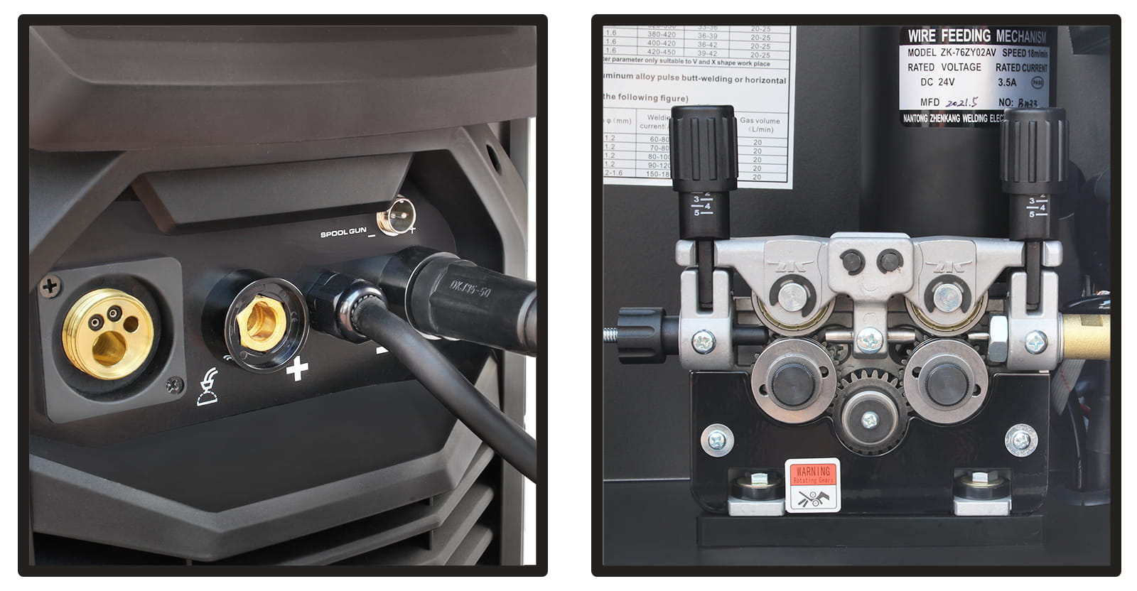 SPOOL GUN - possibility of using a SPOOL GUN torch with a built-in wire feeder (torch not included, available under code MM2S). The method enables welding both with shielding gas and with self-shielded wire without gas.