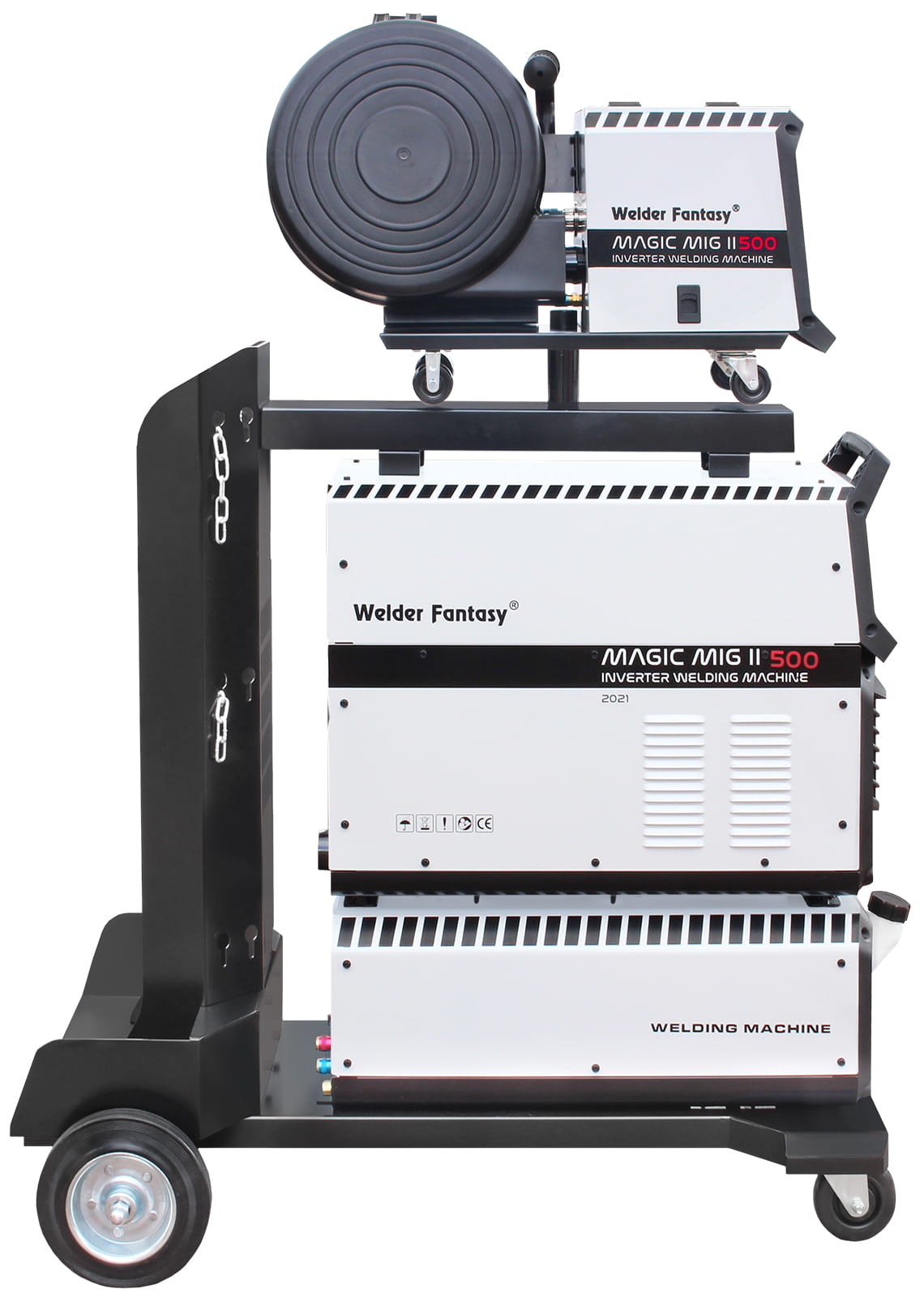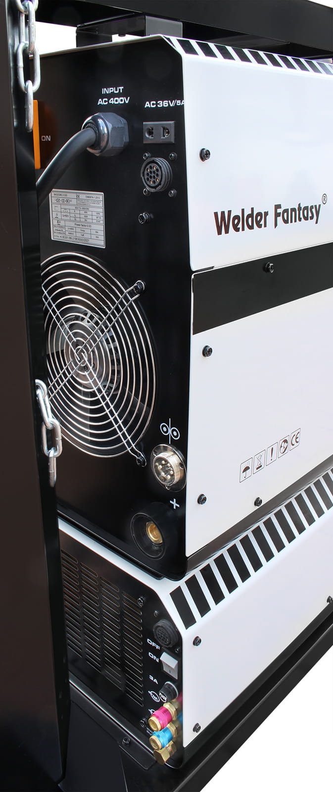 The multifunctional inverter welding semi-automatic machine Welder Fantasy MAGIC MIG II 500 4x4 TOWER is equipped with a cooler and a separate 4-roll wire feeder. The use of a liquid-cooled torch significantly increases working comfort and extends the service life of consumable parts and the torch itself.