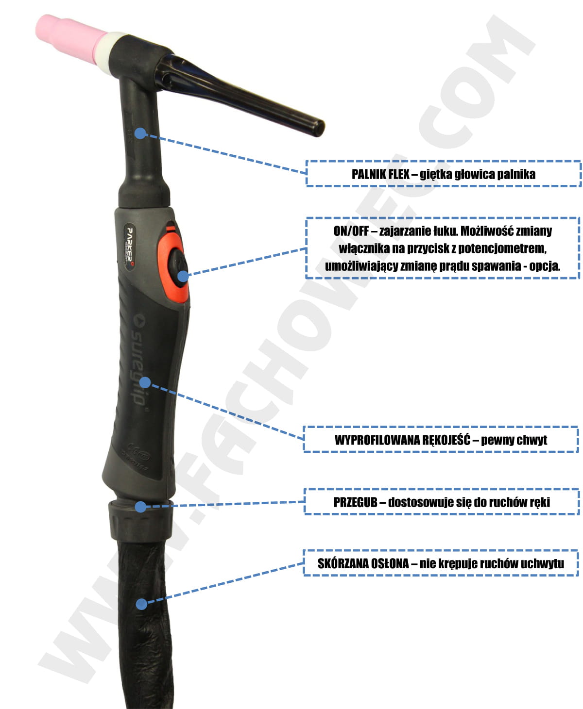 - uchwyt spawalniczy TIG PARKER SUPERGRIP SGT18 FLEX TIG 4 mb (UWAGA! uchwyt chłodzony cieczą, zestaw nie zawiera chłodnicy!)