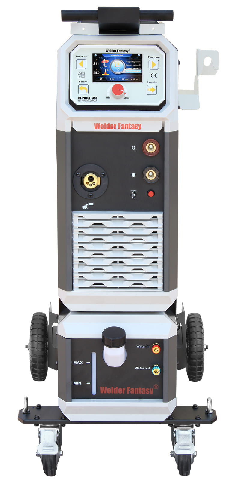 The Welder Fantasy PERFECT BI-PULSE 351 device is a modern, synergic inverter power source integrated with a cooling unit and trolley, offering many possibilities for welding applications. Its main advantages include the ability to weld using single or double pulse current in MIG or MAG mode, as well as the option to use synergic settings.