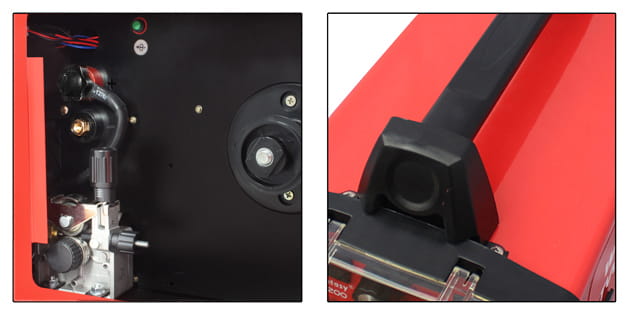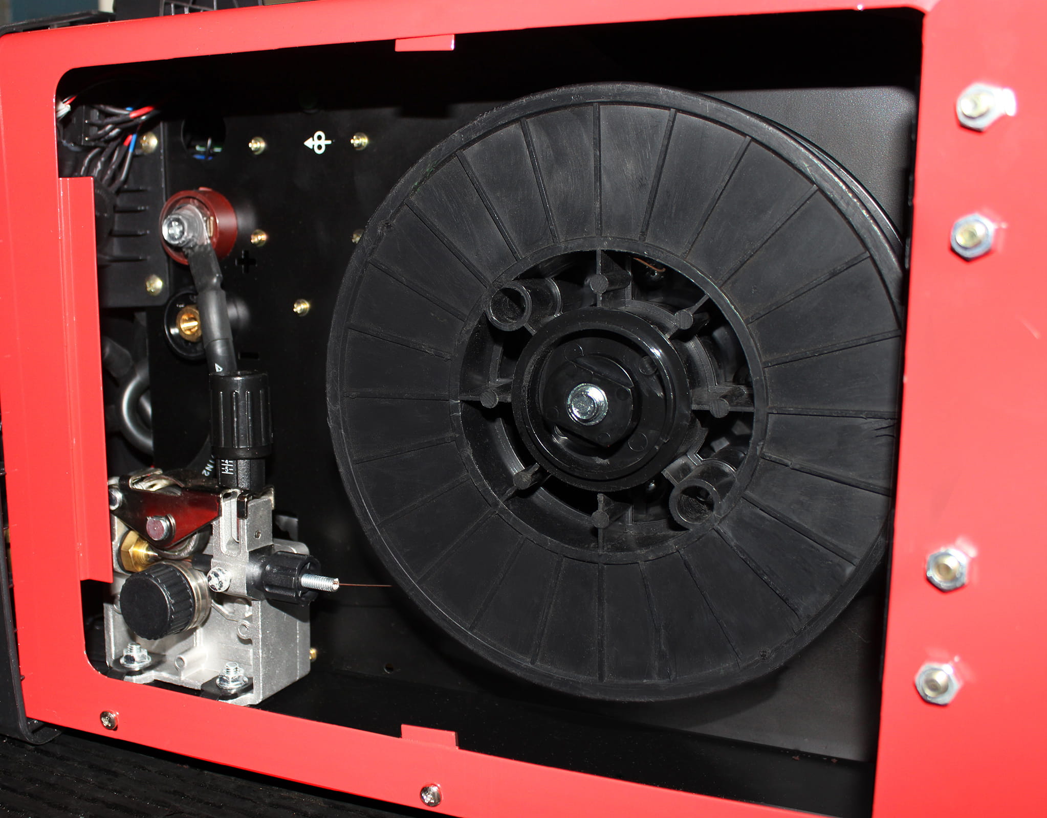 The welding machine features smooth adjustment of welding current, smooth adjustment of wire feed speed, smooth inductance control, and is equipped with a thermal overload protection system to prevent overheating.