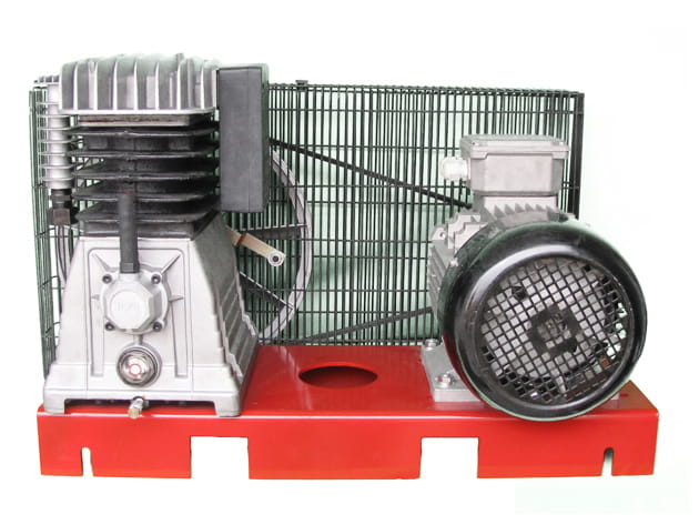 Wysokiej klasy, profesjonalny zestaw sprężarkowy: agregat z żeliwnym blokiem, dwutłokowy, jednostopniowy, rzędowy, smarowany olejowo o wydajności 620 l/min i silnikiem 4 kW, zasilanym napięciem 400V.