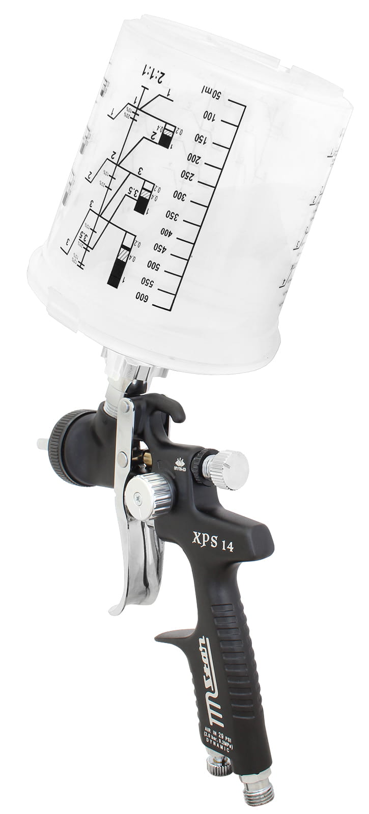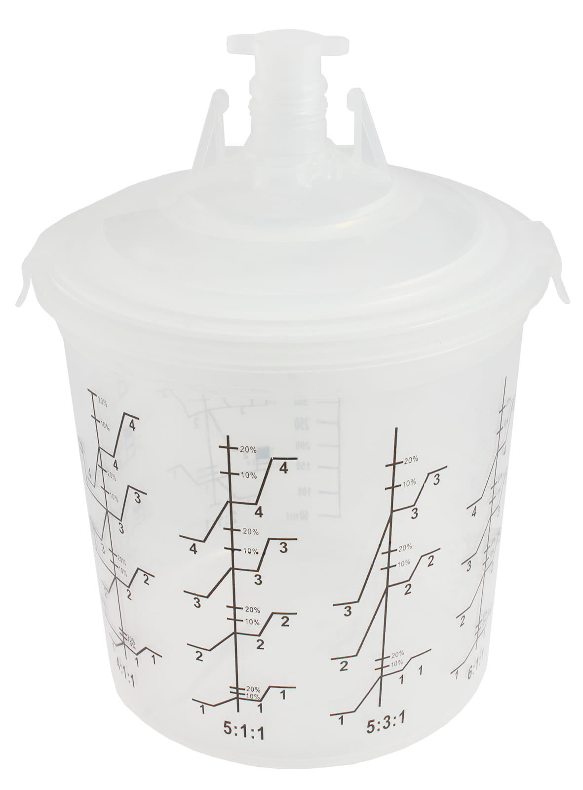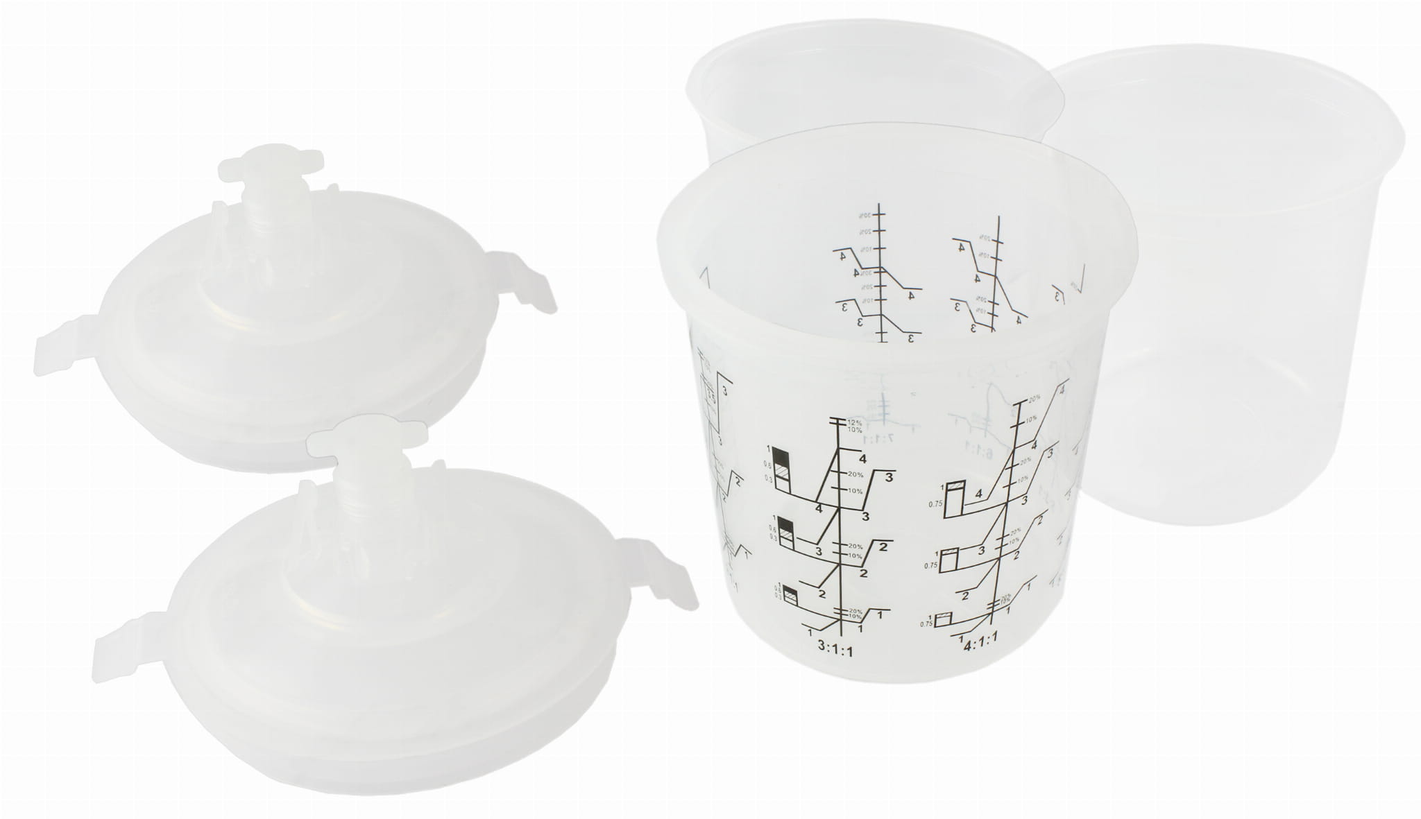 Zbiornik z podziałką i 2 wkładami służącymi do mieszania, lakierowania, dopełniania i przechowywania. Podziałki zawierają najczęściej stosowane proporcje mieszania z uwzględnieniem procentowego dodatku rozpuszczalnika czy innych dodatków.
