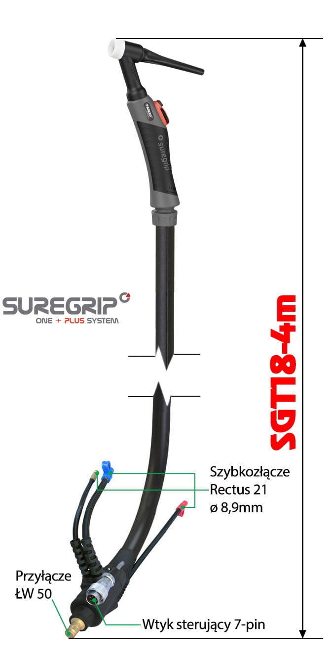 Światowej klasy uchwyt spawalniczy PARKER SUREGRIP ERGO TIG SGT18FX 4m z giętkim uchwytem i potencjometrem 10kΩ, chłodzony cieczą, przeznaczony do spawania metodą TIG.