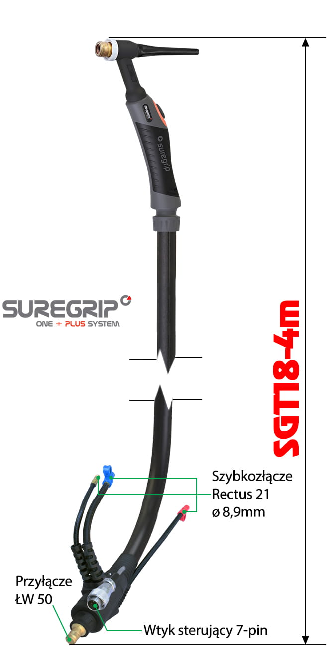 PARKER SUREGRIP torches are equipped with a SURELOK connector, which is the most popular type of connection in the world. The torch plug has been configured to achieve the smallest possible size. The compact design of the SURELOK connection allows it to fit any TIG welding machine equipped with a ŁW 50 socket.