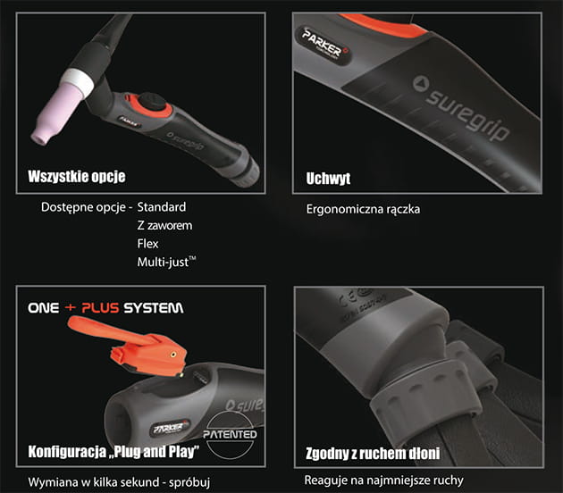 All PARKER SUREGRIP torches are equipped with a unified, multifunctional system enabling quick configuration according to user needs. Once selected, the welding torch can be freely configured through simple and quick changes in accordance with the "Plug & Play" system. PARKER TORCHOLOGY ONE + PLUS SYSTEM is the only way to purchase high-class welding torches.
