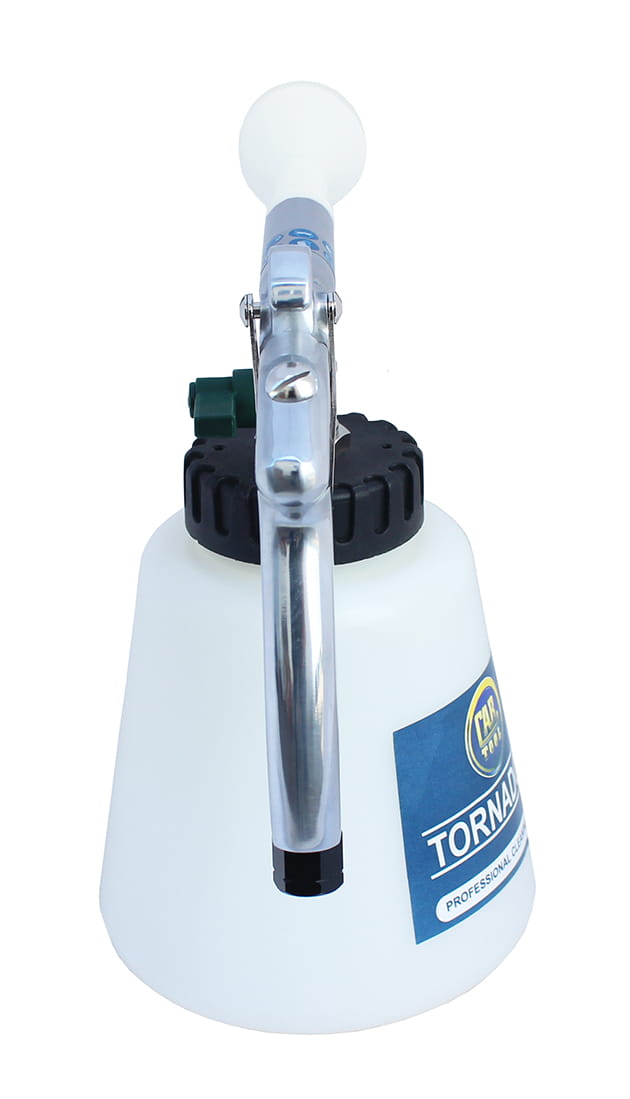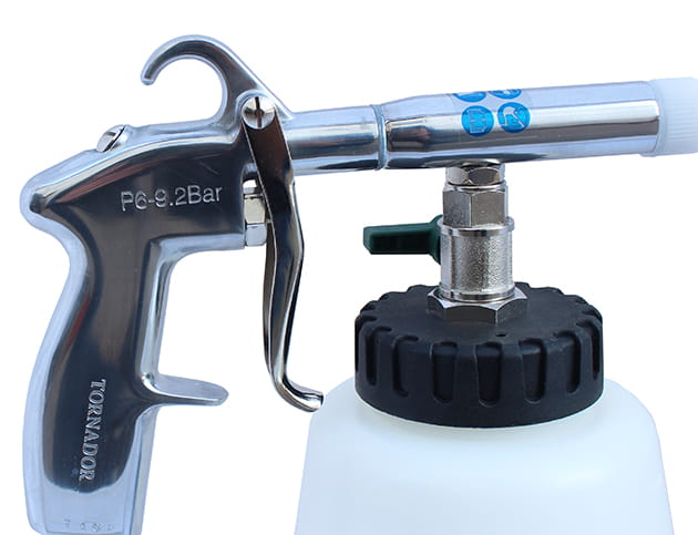Pistolet dzięki specjalnie ukształtowanej dyszy z wirującym rdzeniem, wytwarza pulsacyjne ciśnienie, które rozpyla aktywny środek czyszczący. W ten sposób uzyskuje się tzw. efekt tornada, który z dużą siłą usuwa wszelkie zanieczyszczenia i kurz. Urządzenie czyści wszystkie elementy, przy niewielkim stopniu zwilżenia i minimalnym poziomie zużycia środka czyszczącego. Przy użyciu odpowiedniego środka czyszczącego TORNADOR, pozwala na usunięcie plam z czekolady, tłuszczu, kawy, a także sierści i gum do żucia.
