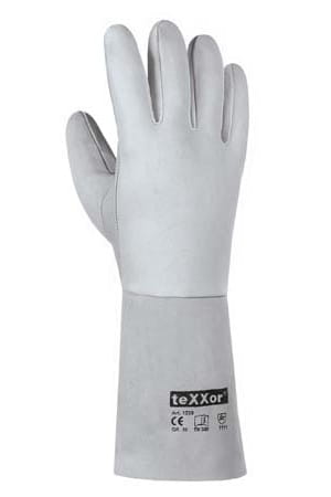 Rękawice typu spawalniczego, ochronne, zapewniające znakomite czucie, wykonane w części chwytnej z delikatnej skóry licowej koziej, w kolorze białym.