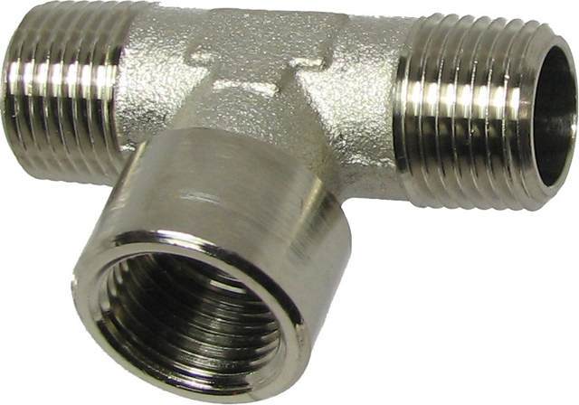 Mosiężny (mosiądz niklowany) rozdzielacz trójnik 2 x 1/4"Z + 1 x 1/4"W typ T.